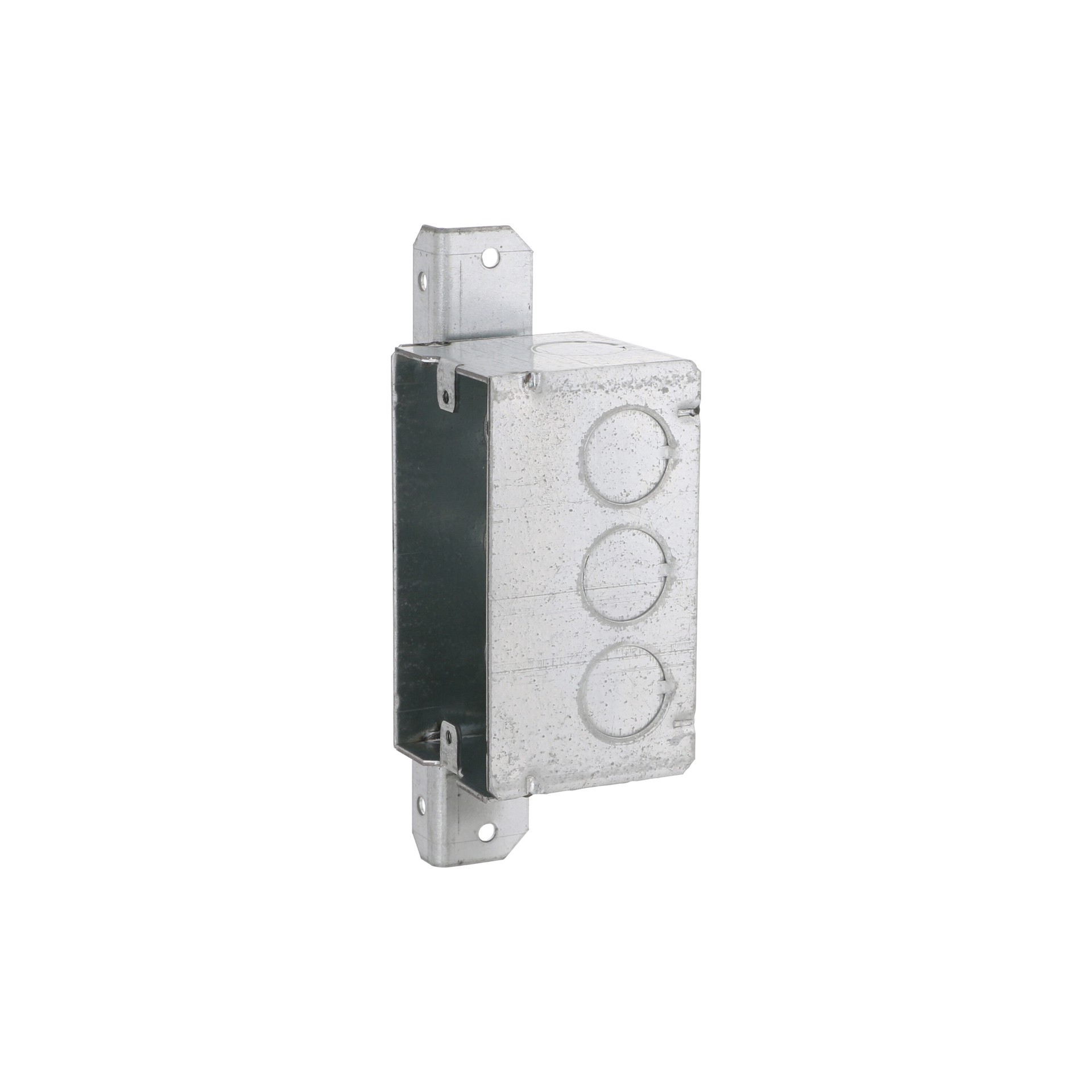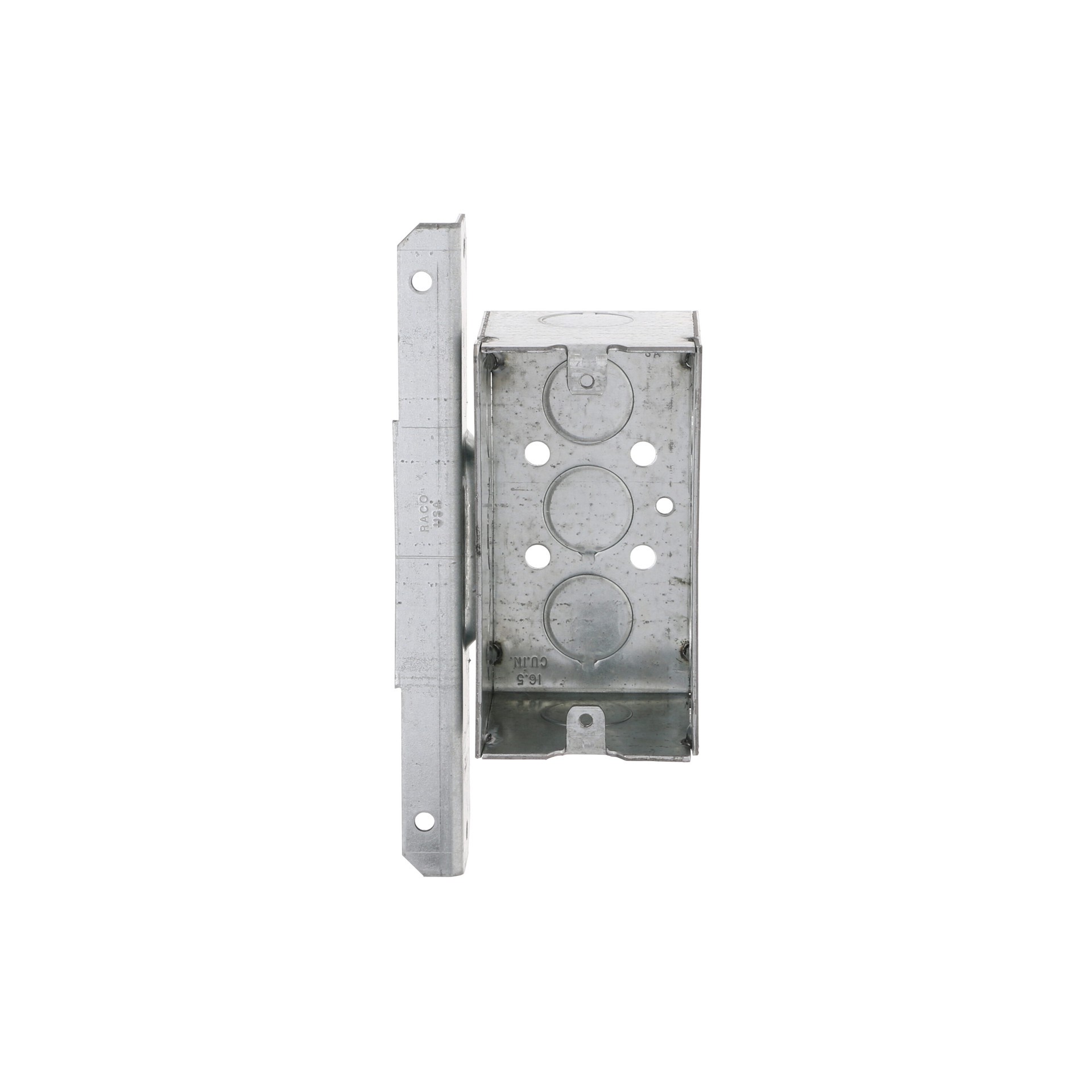 Eight 1/2 in knockouts. 2-1/8 in depth. Welded construction. Positions box against face and side of metal or wood stud. 16.5 cu in capacity. cULus Listed.