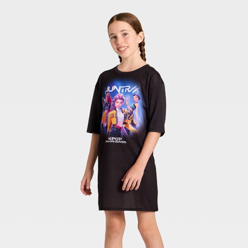 Keep it comfy and golden in this Girls' KPop Demon Hunters Oversized Sleep T-Shirt. Made from a jersey fabric, this sleep shirt features Rumi, Mira and Zoey and is perfect for the KPop Demon Hunters f…