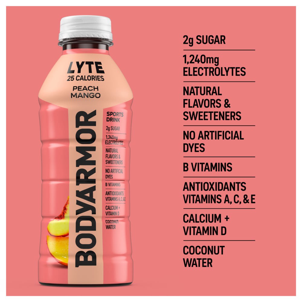 - 20 fl oz bottles of BODYARMOR Lyte Peach Mango electrolyte drinks for hydration that keeps pace with your active lifestyle