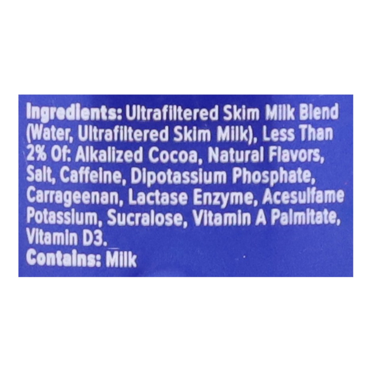 Ultrafiltered Skim Milk Blend (Water, Ultrafiltered Skim Milk), Less than 2% of: Alkalized Cocoa, Natural Flavors, Salt, Caffeine, Dipotassium Phosphate, Carrageenan, Lactase Enzyme, Acesulfame Potass…