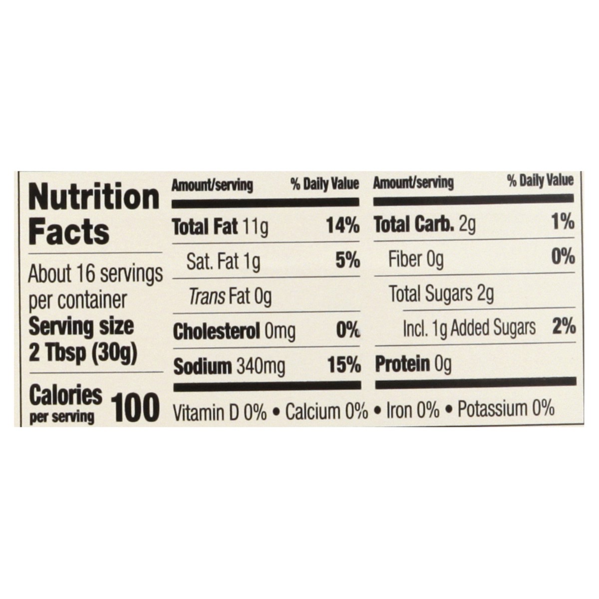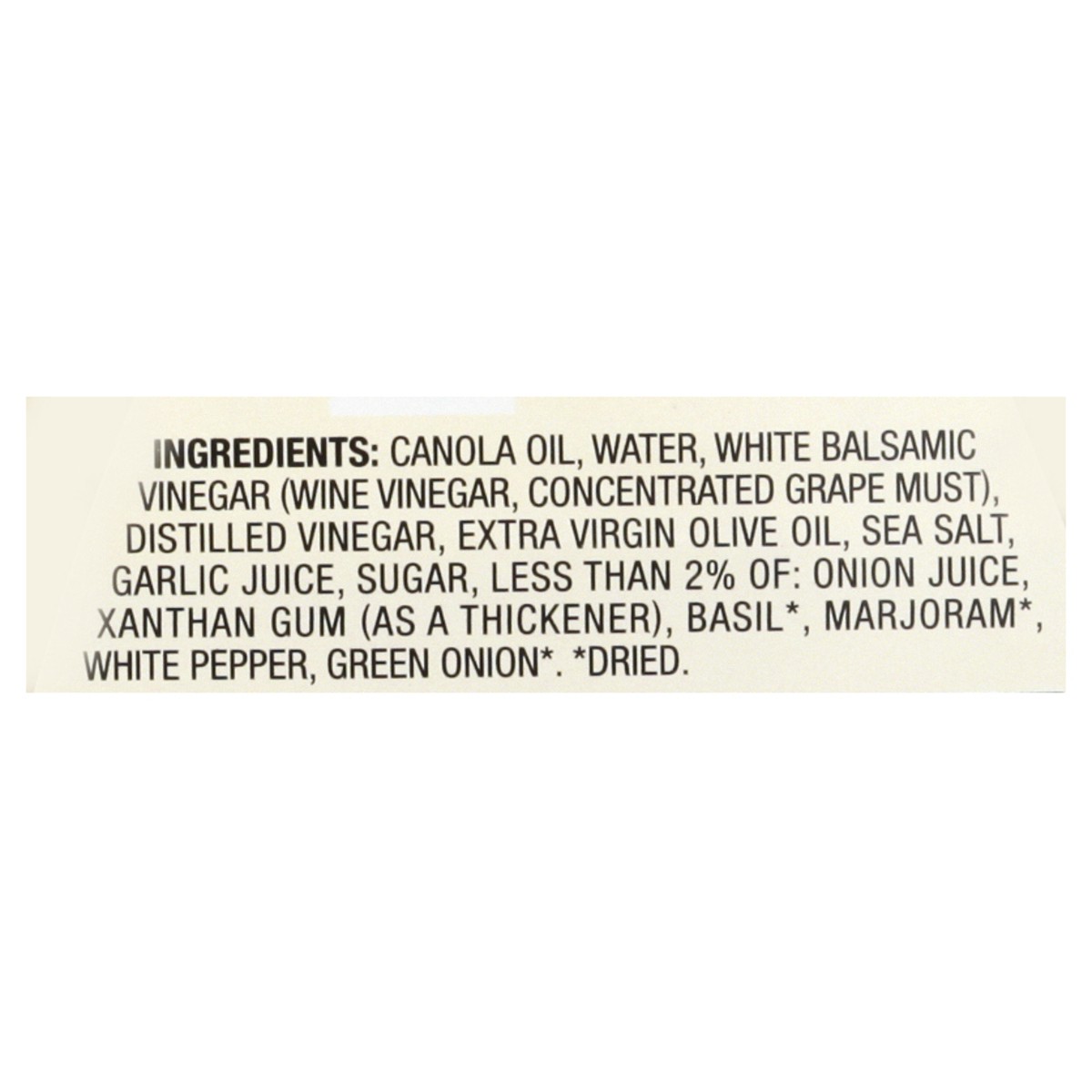 Canola Oil, Water, White Balsamic Vinegar (Wine Vinegar, Concentrated Grape Must), Distilled Vinegar, Extra Virgin Olive Oil, Sea Salt, Garlic Juice, Sugar, Less than 2% of: Onion Juice, Xanthan Gum (…