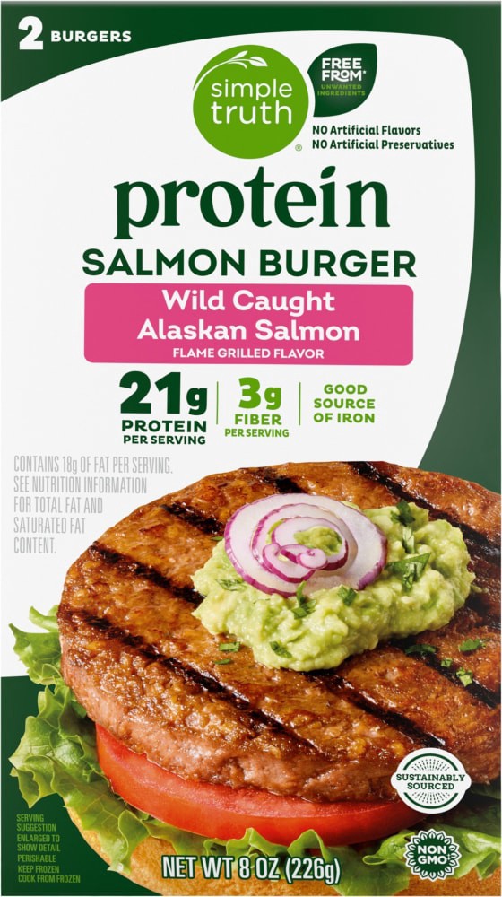 Simple Truth® Wild Caught Alaskan Protein Salmon Burger delivers delicious salmon flavor for mealtimes! Each box holds two burgers with 21g protein per burgerˆ. Wild pink salmon burgers that are an ea…