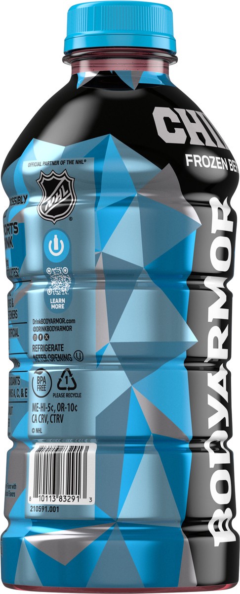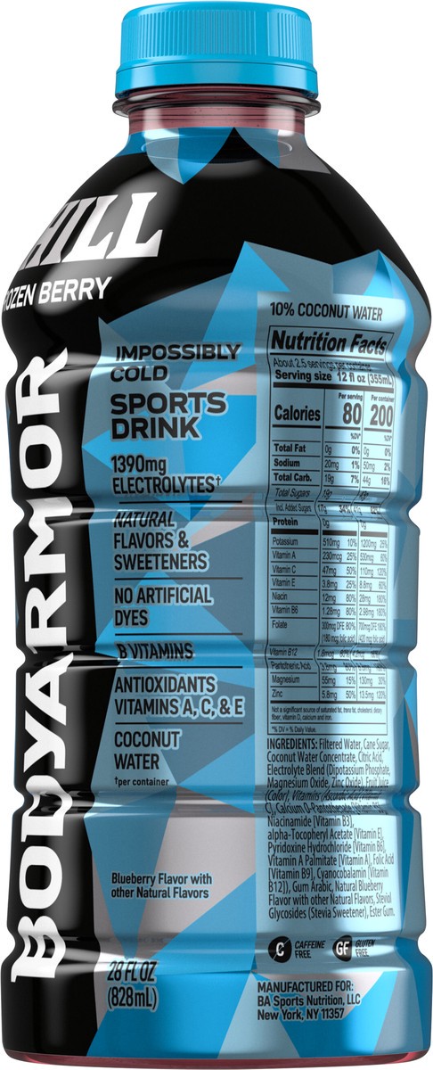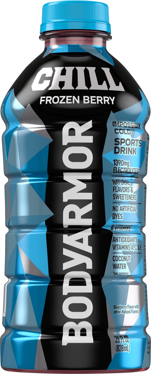 - And dyesMade with potassium-packed electrolytes and antioxidants to support hydrationSports beverage made with coconut water and naturally flavored with a rush of frozen berry to help hydrate your way to victory28 fl oz bottle of BODYARMOR Chill Frozen Berry