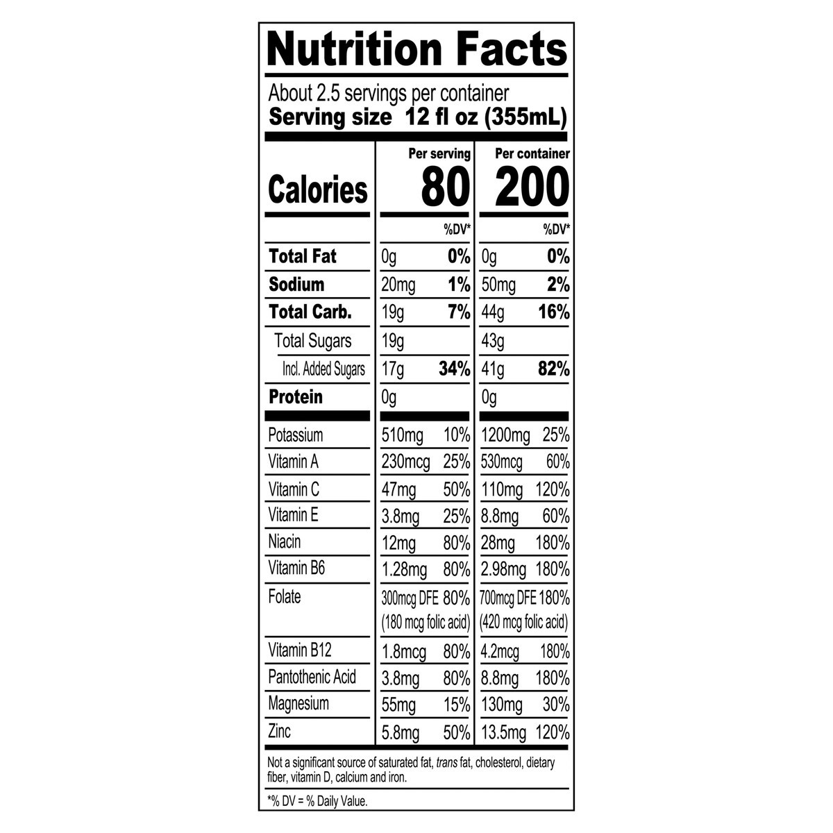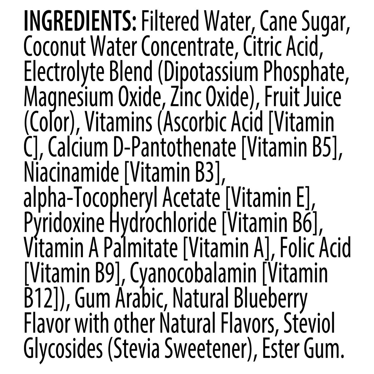 Filtered Water, Cane Sugar, Coconut Water Concentrate, Citric Acid, Electrolyte Blend (Dipotassium Phosphate, Magnesium Oxide, Zinc Oxide), Fruit Juice (Color), Vitamins (Ascorbic Acid [Vitamin C], Ca…