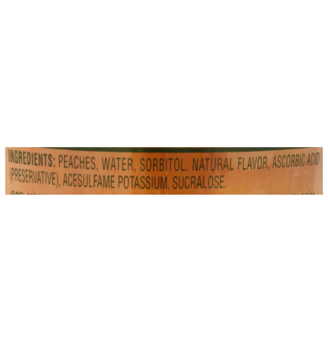 In artificially sweetened water. 50% fewer calories. 50% less sugar (Peach chunks NSA 50 cals, 10 g sugar; Peach chunks in extra light syrup 100 cals, 21 g sugar per 184 g serving). No sugar added. Ex…
