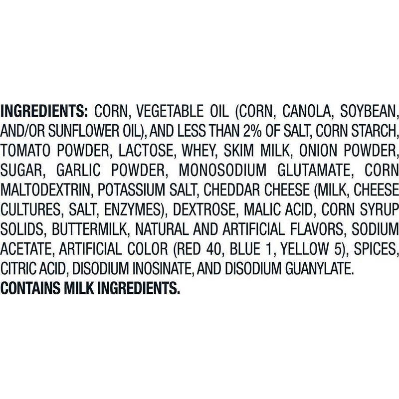 Corn, Vegetable Oil (Corn, Canola, Soybean, and/or Sunflower Oil), and Less than 2% of Salt, Corn Starch, Tomato Powder, Buttermilk, Lactose, Onion Powder, Sugar, Skim Milk, Cheddar Cheese (Milk, Chee…