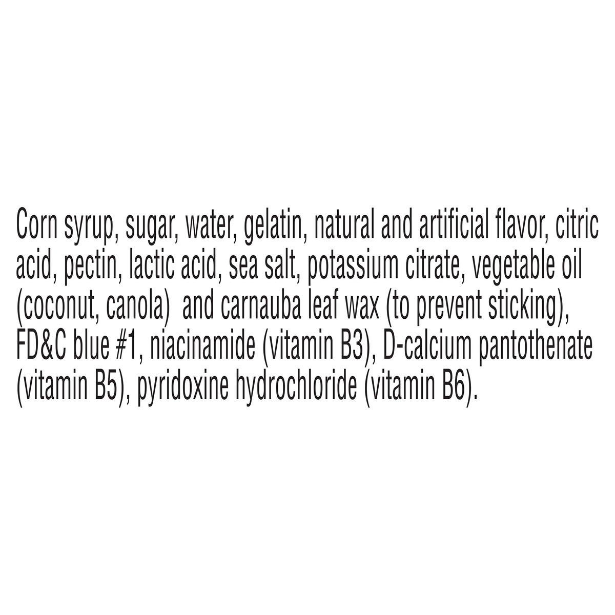 Corn Syrup, Sugar, Water, Gelatin, Natural and Artificial Flavor, Citric Acid, Pectin, Lactic Acid, Sea Salt, Potassium Citrate, Vegetable Oil (Coconut, Canola) and Carnauba Leaf Wax (to Prevent Stick…