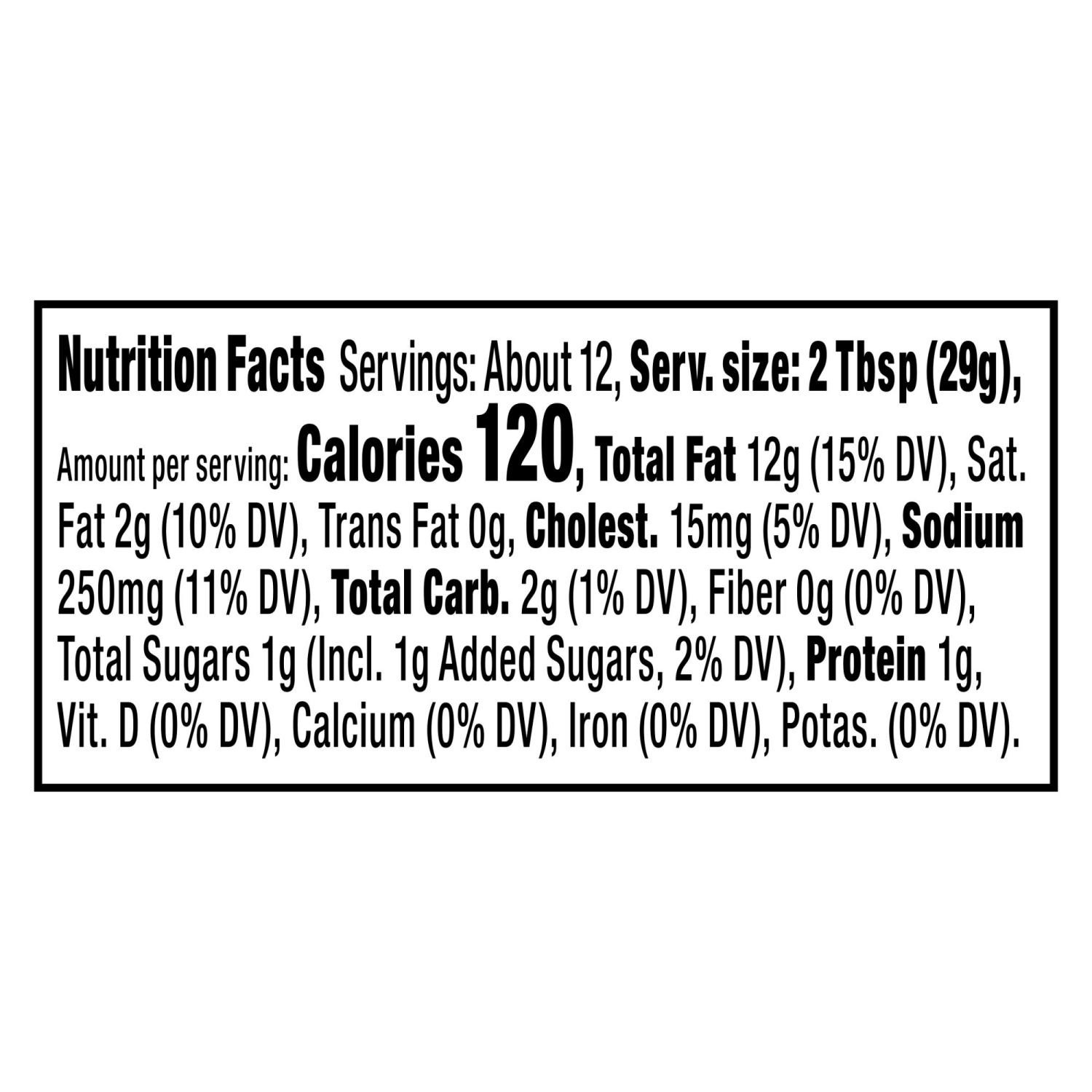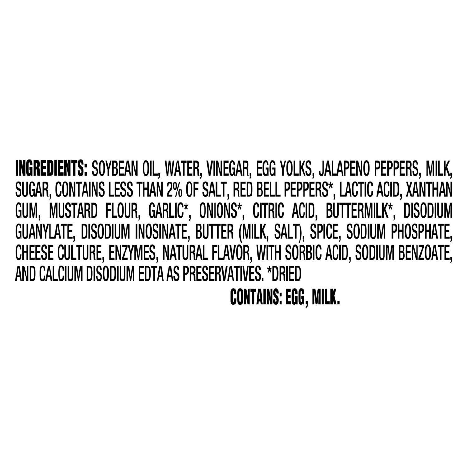 Soybean Oil, Water, Vinegar, Egg Yolks, Jalapeno Peppers, Milk, Sugar, Contains Less than 2% of Salt, Red Bell Peppers*, Lactic Acid, Xanthan Gum, Mustard Flour, Disodium Inosinate and Disodium Guanyl…