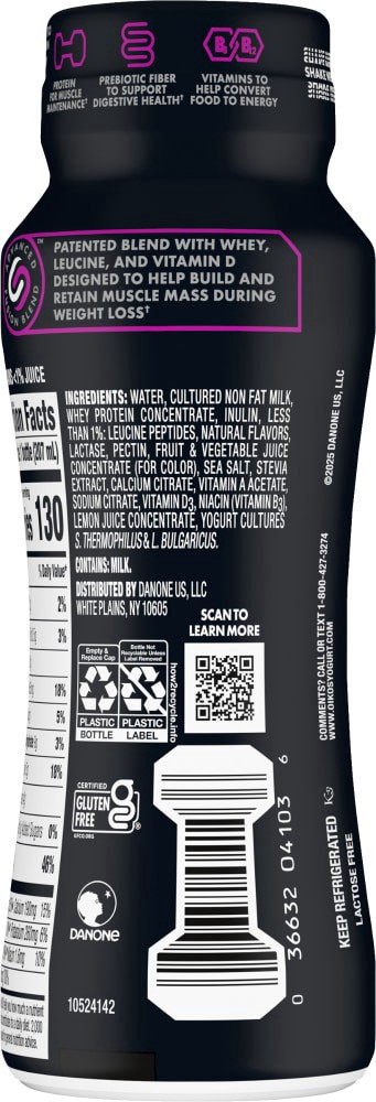 WATER, CULTURED NON FAT MILK, WHEY PROTEIN CONCENTRATE, INULIN, LESS THAN 1%: LEUCINE PEPTIDES, NATURAL FLAVORS, LACTASE, PECTIN, FRUIT & VEGETABLE JUICE CONCENTRATE (FOR COLOR), SEA SALT, STEVIA …