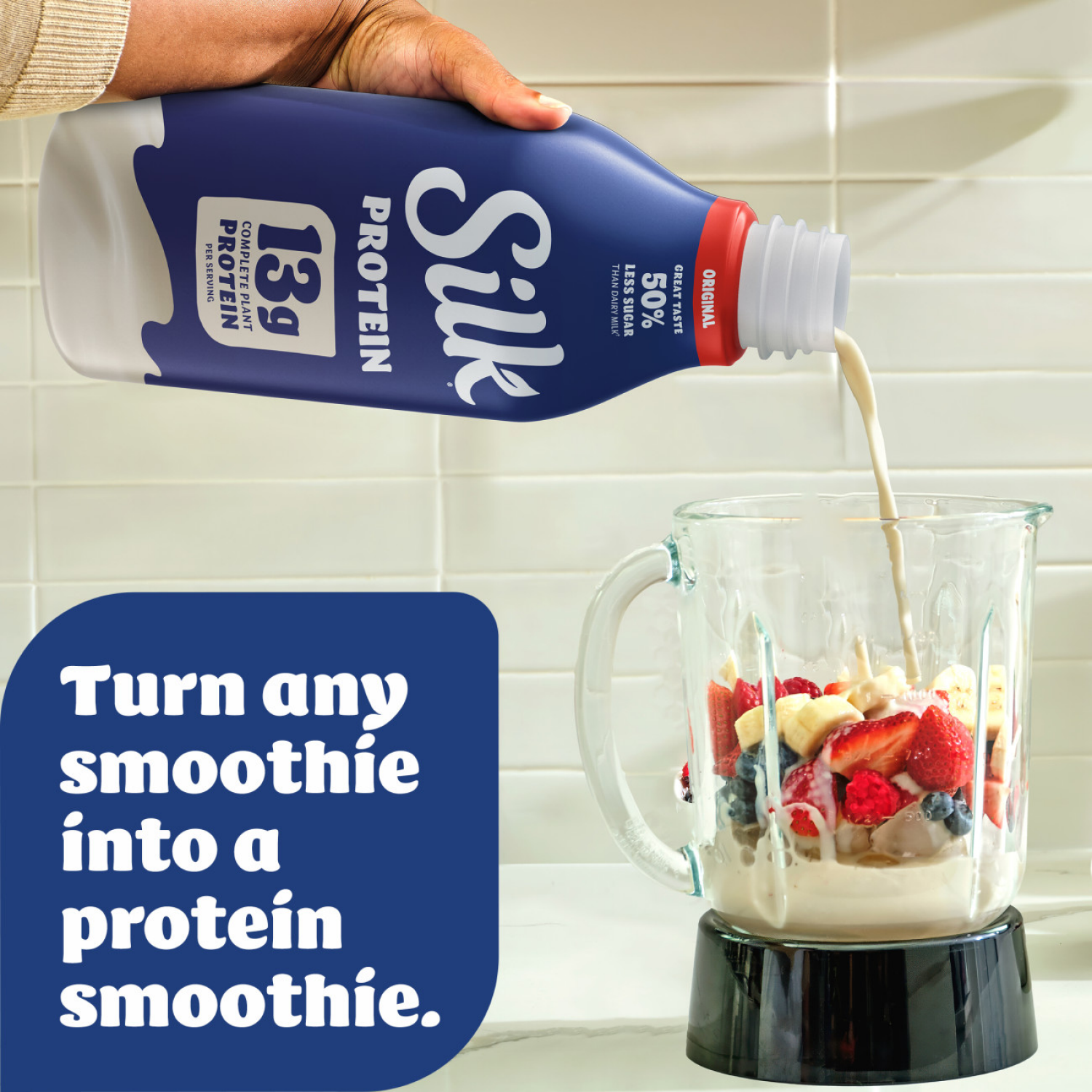 Say hello to the pour that gives you more with Silk Protein Complete Plant Protein Milk. A high protein plant based milk, Silk soy protein milk contains 13g complete plant protein per serving, 50% mor…