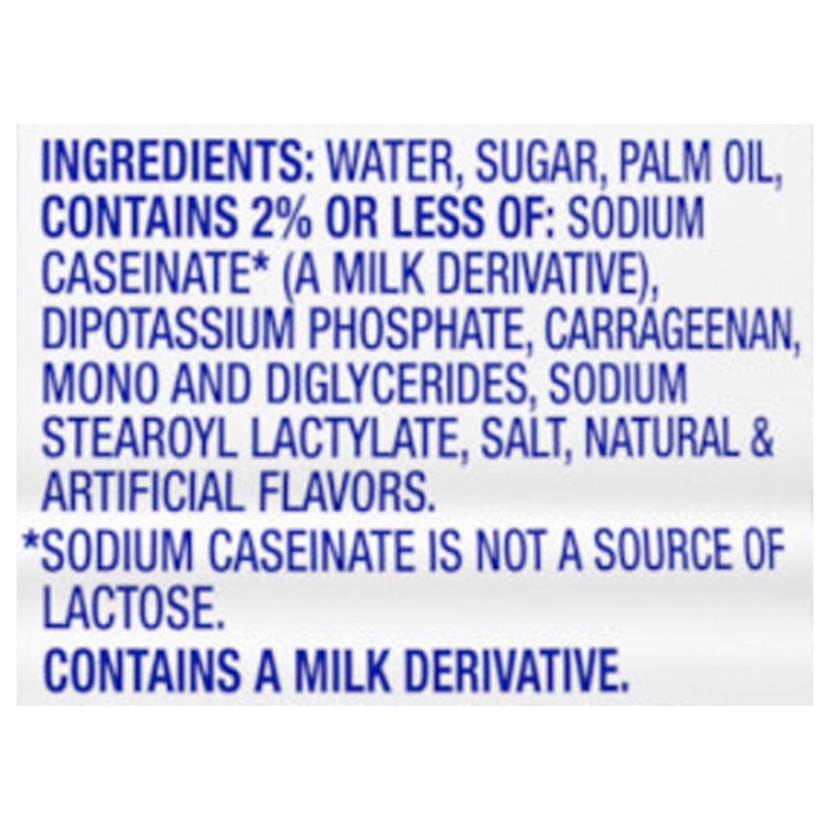Water, Sugar, Palm Oil, Contains 2% or Less of: Sodium Caseinate* (a Milk Derivative), Dipotassium Phosphate, Carrageenan, Mono and Diglycerides, Sodium Stearoyl Lactylate, Salt, Natural & Artificial …