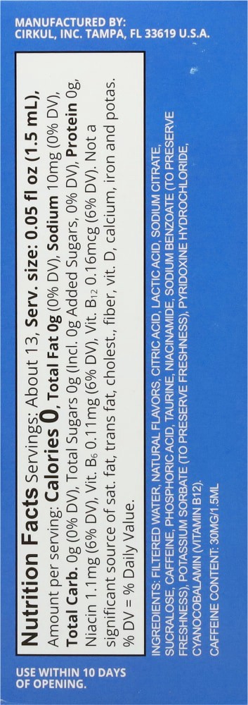 Filtered Water, Natural Flavors, Citric Acid, Lactic Acid,Sodium Citrate, Sucralose, Caffeine, Phosphoric Acid, Taurine,Niacinamide, Sodium Benzoate (To Preserve Freshness), Potassium Sorbate(To Prese…