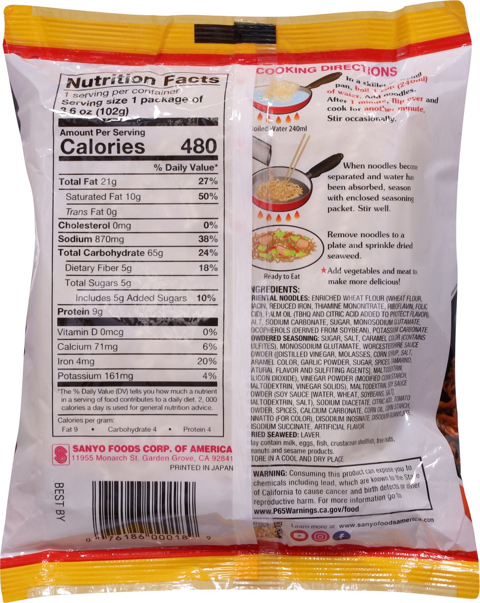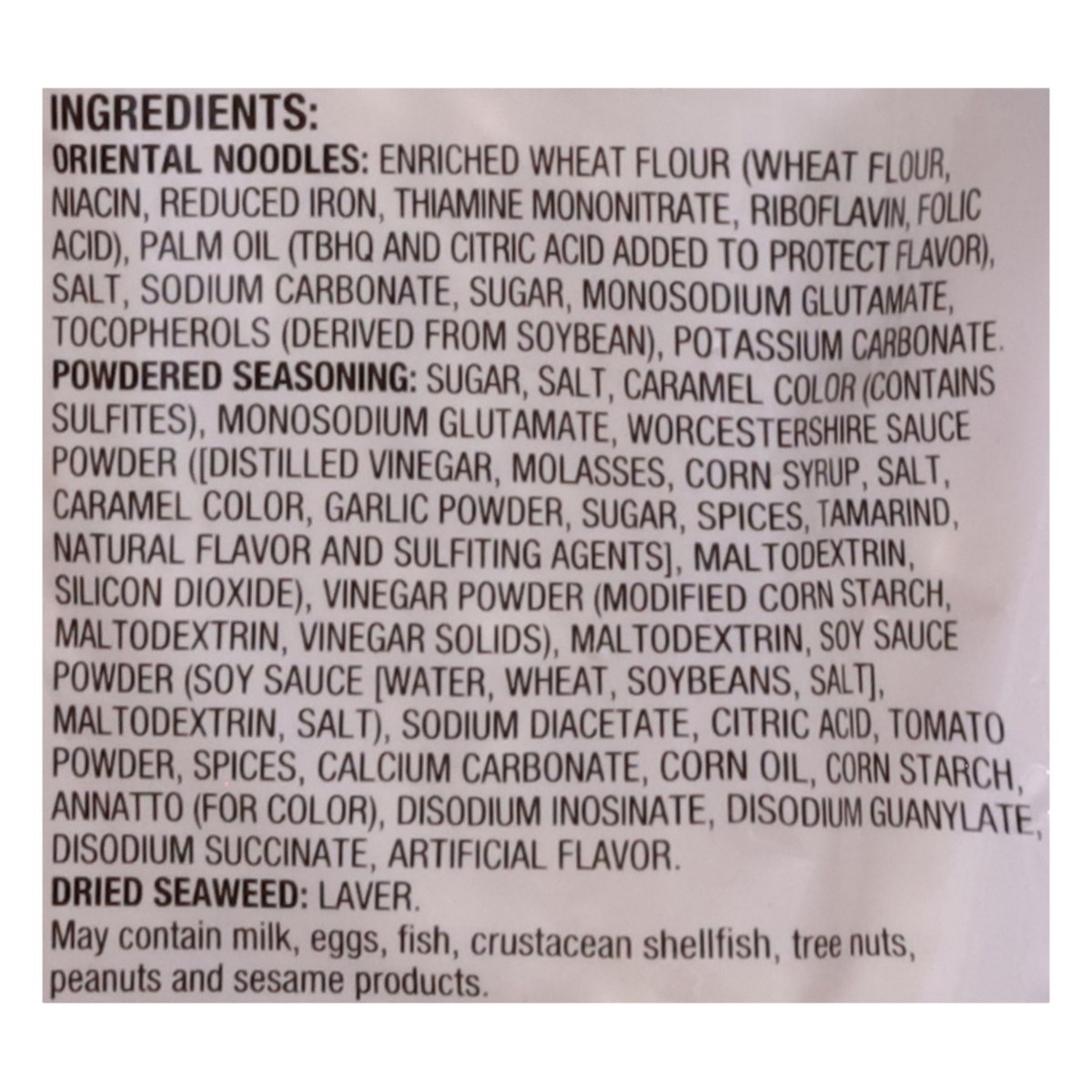 Oriental Noodles: Enriched Wheat Flour (Wheat Flour, Niacin, Reduced Iron, Thiamine Mononitrate, Riboflavin, Folic Acid), Palm Oil (TBHQ and Citric Acid Added to Protect Flavor), Salt, Sodium Carbonat…