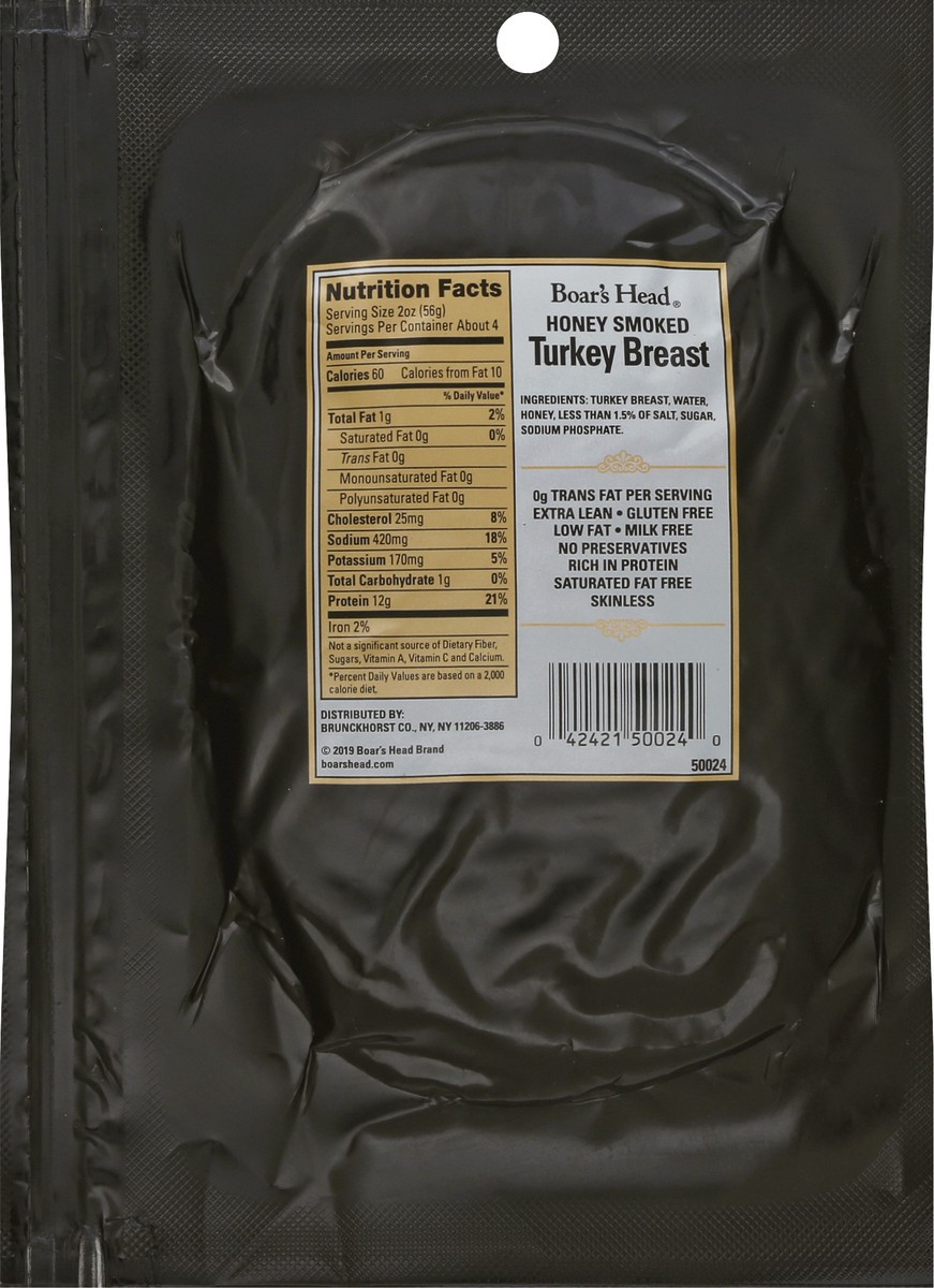 With a pleasantly mild and flavorful taste, Boar's Head Honey Smoked Turkey Breast is lightly smoked and hand coated in golden honey for a delicately smoky, subtly sweet flavor in every slice.