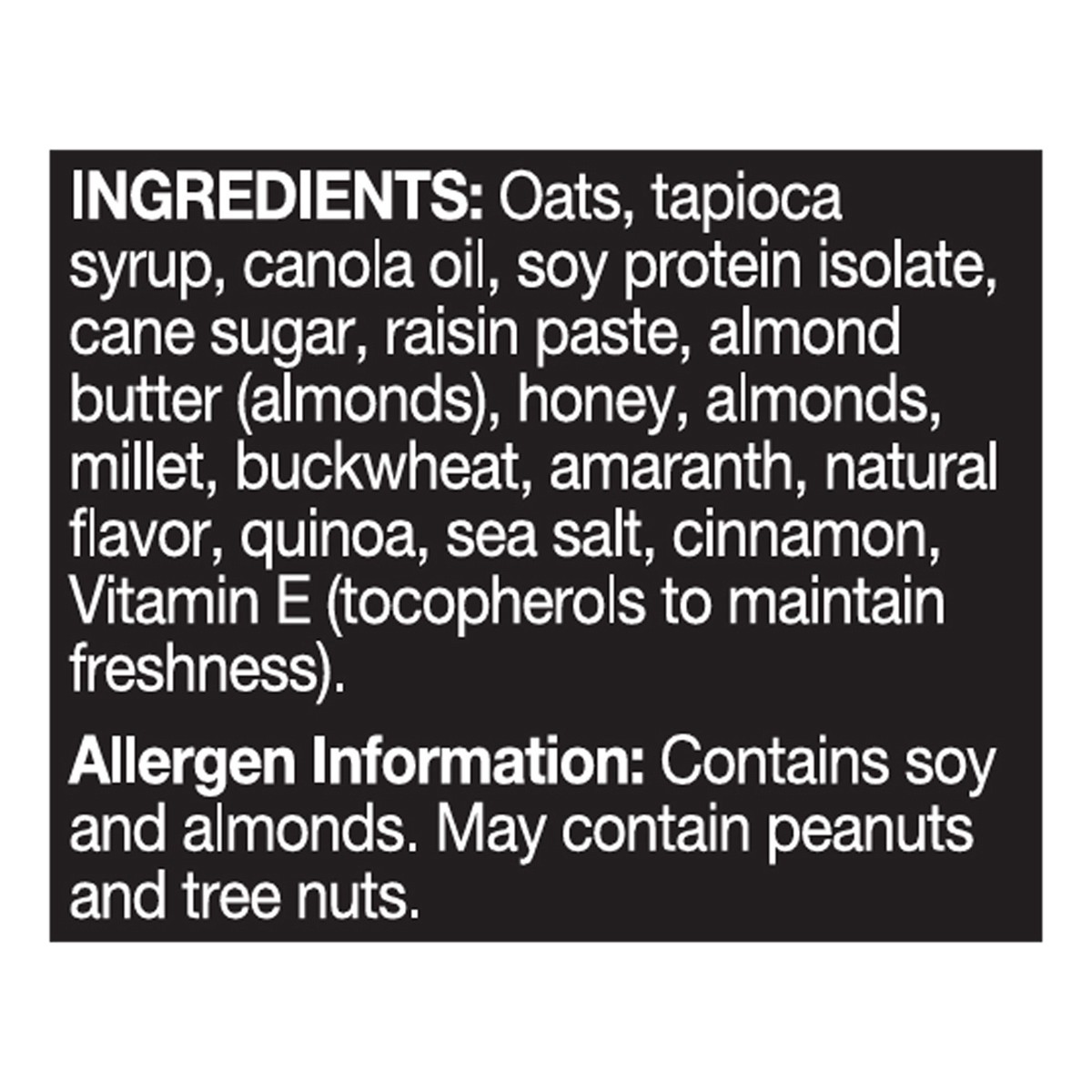 Oats, Tapioca Syrup, Canola Oil, Soy Protein Isolate, Cane Sugar, Raising Paste, Almond Butter (Almonds), Honey, Almonds, Millet, Buckwheat, Amaranth, Natural Flavor, Quinoa, Sea Salt, Cinnamon, Vitam…
