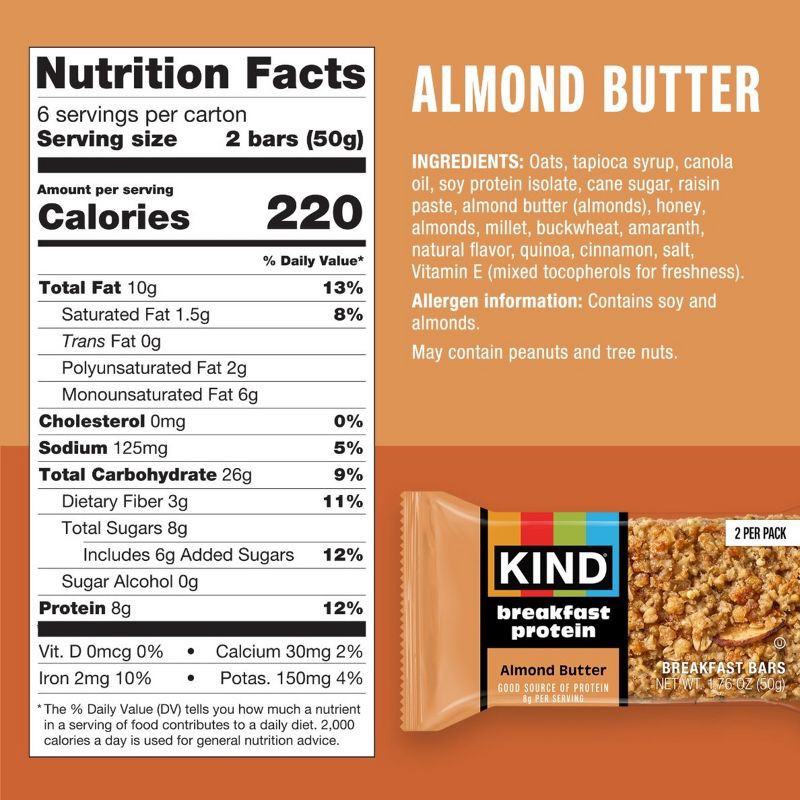 - Six 1.76 oz KIND Breakfast bars, Protein Almond Butter soft-baked snack bars