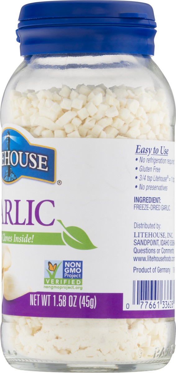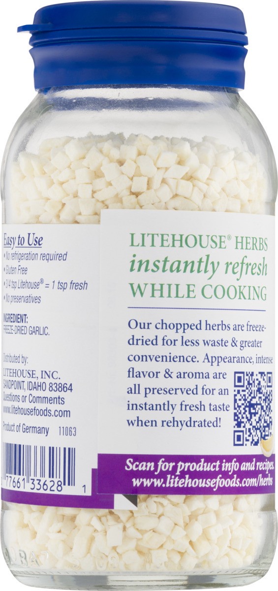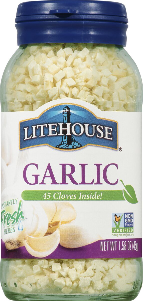 Litehouse Freeze -Dried Garlic embodies the full taste of fresh garlic without the peeling and chopping. Mix in your mashed potatoes or marinade your meat. One jar is equal to 45 cloves of fresh garli…
