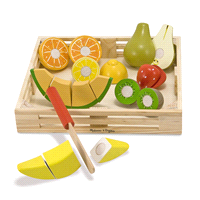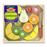 This set contains eight pieces of wooden food, a cutting board and a wooden knife. Cutting the food makes a satisfying "crunch"--and a playful introduction to concepts of "whole," "part," and fraction…