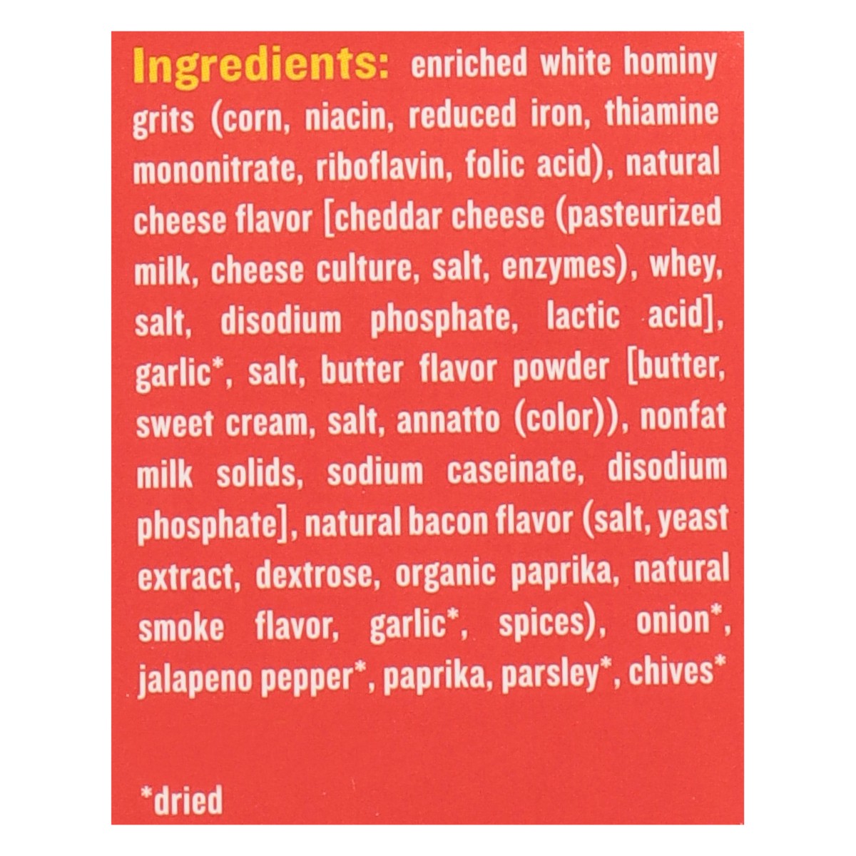 Enriched White Hominy Grits (Corn, Niacin, Reduced Iron, Thiamine Mononitrate, Riboflavin, Folic Acid), Natural Cheese Flavor [Cheddar Cheese (Pasteurized Milk, Cheese Culture, Salt, Enzymes), Whey, S…