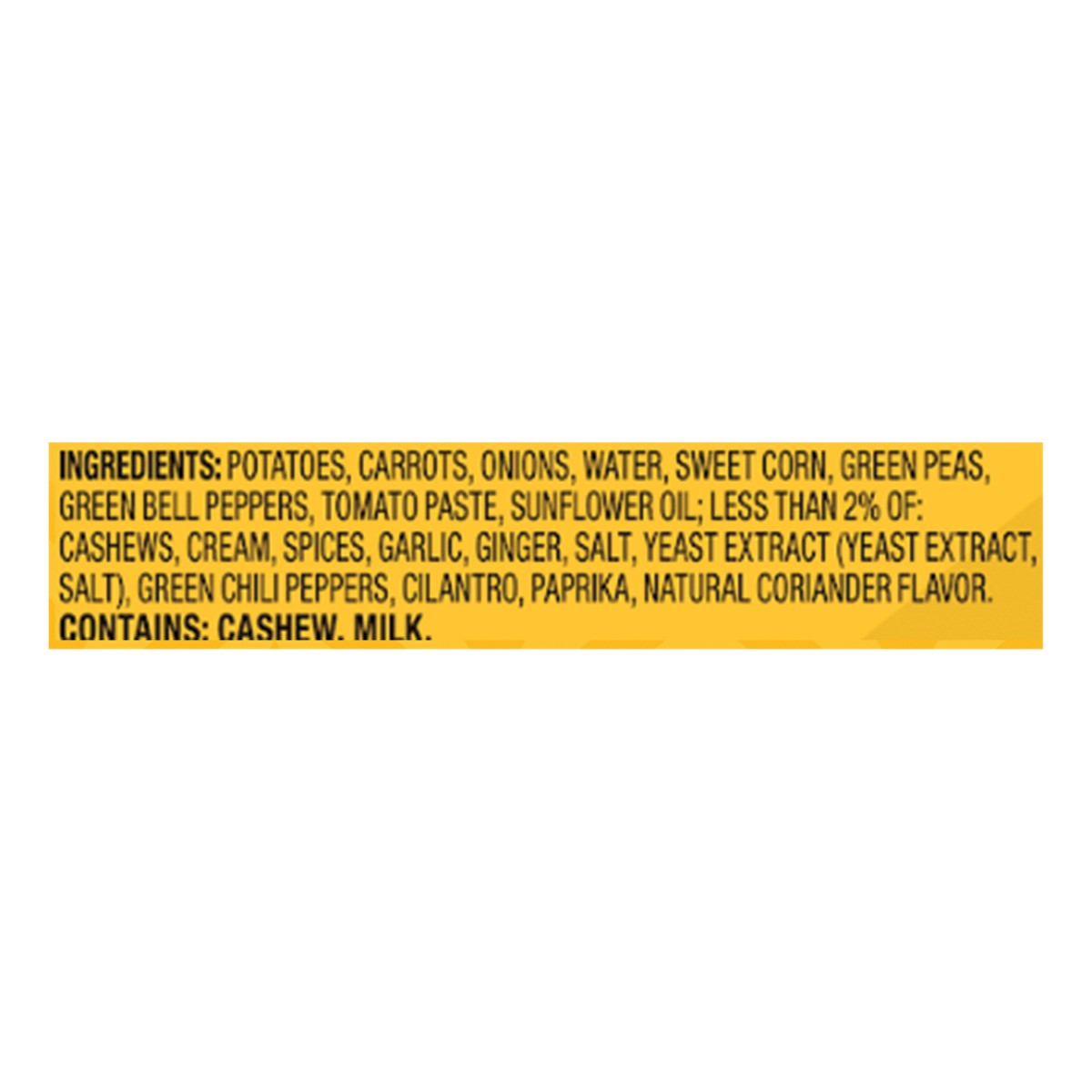Potatoes, Carrots, Onions, Water, Sweet Corn, Green Peas, Green Bell Peppers, Tomato Paste, Sunflower Oil; Less than 2% of: Cashews, Cream, Spices, Garlic, Ginger, Salt, Yeast Extract (Yeast Extract, …