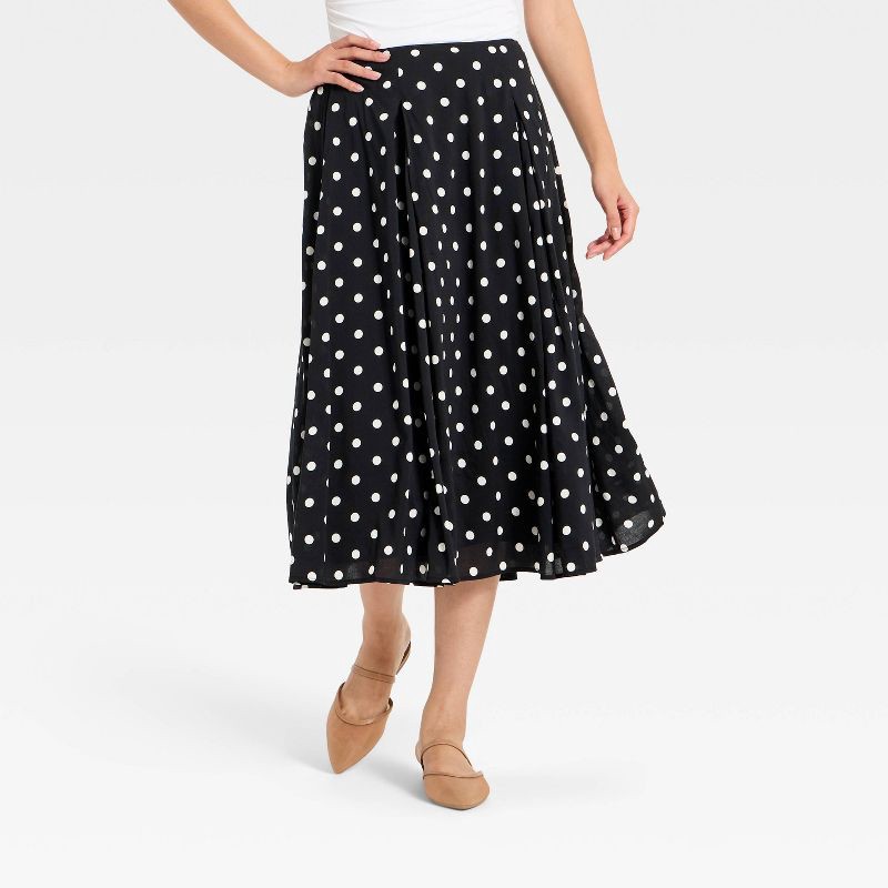Women's Pull-On Pleated Voile Full Midi Skirt - A New Day™ Black Dot M