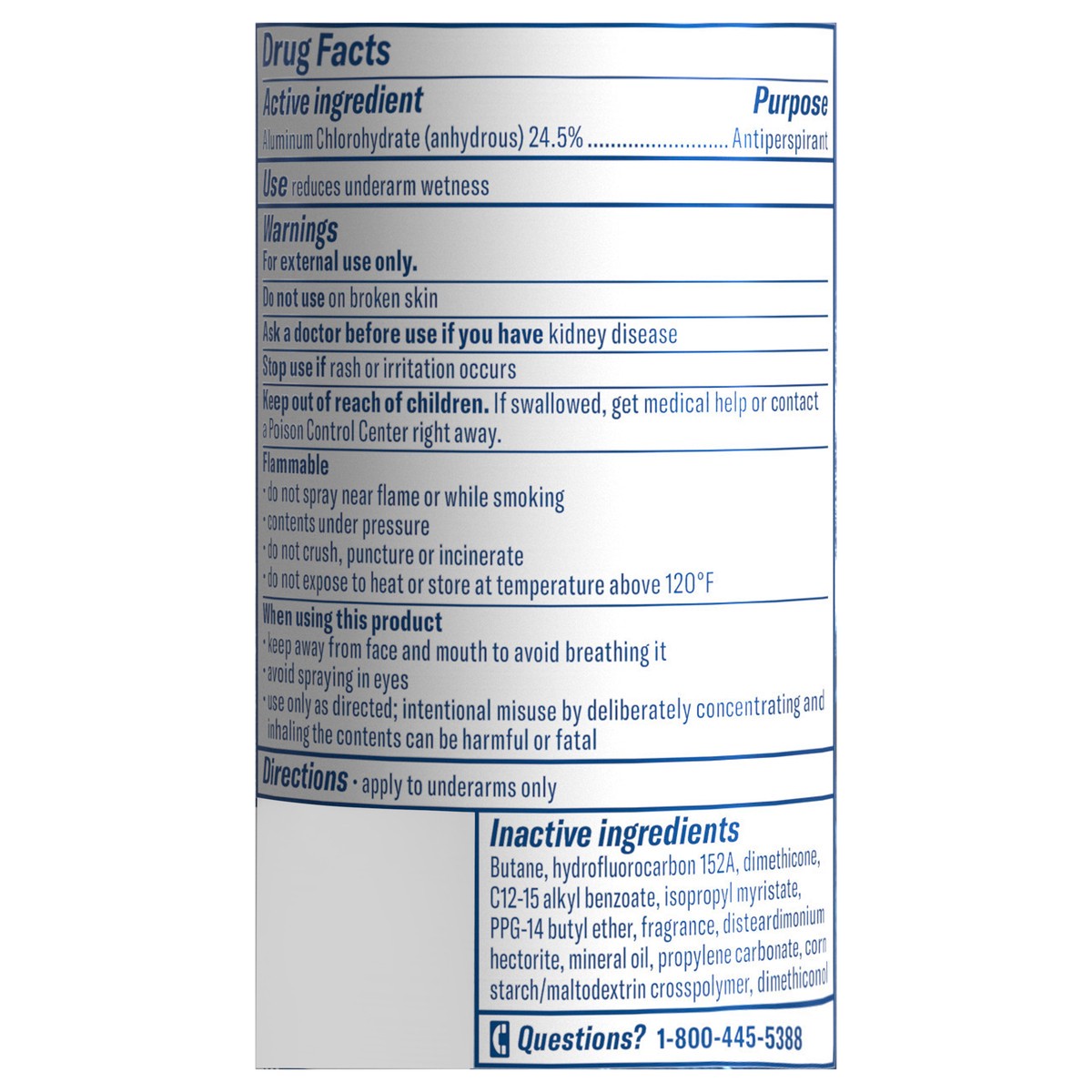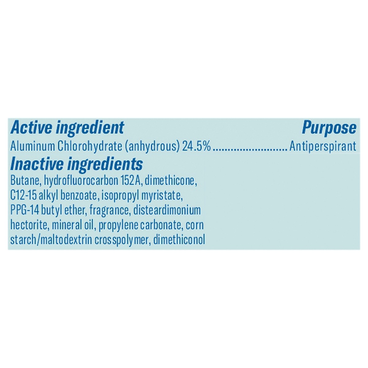 Active Ingredients: Aluminum Chlorohydrate (Anhydrous) (24.5 %), Antiperspirant. Inactive Ingredients: Butane, Hydrofluorocarbon 152A, Dimethicone, C12-15 Alkyl Benzoate, Isopropyl Myristate, PPG-14 B…