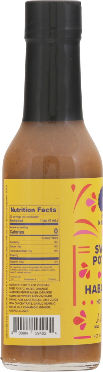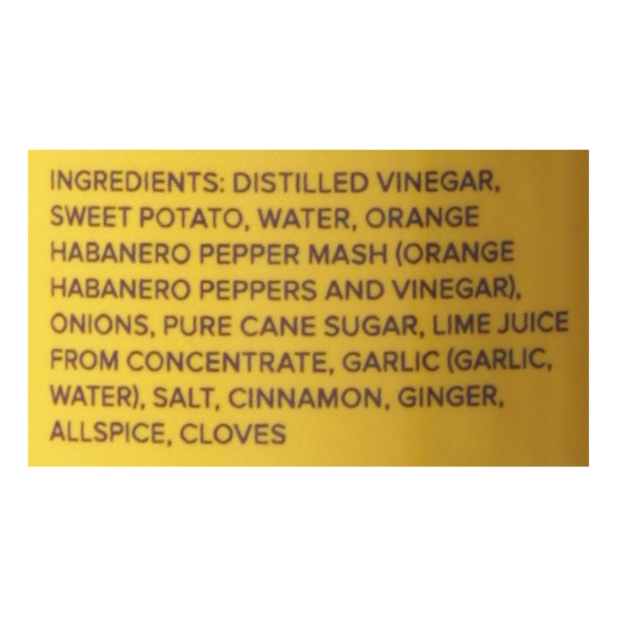 Distilled Vinegar, Sweet Potato, Water, Orange Habanero Pepper Mash (Orange Habanero Peppers and Vinegar), Onions, Pure Cane Sugar, Lime Juice from Concentrate, Garlic (Garlic, Water), Salt, Cinnamon,…