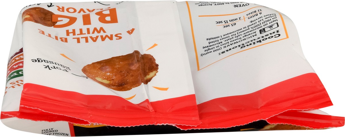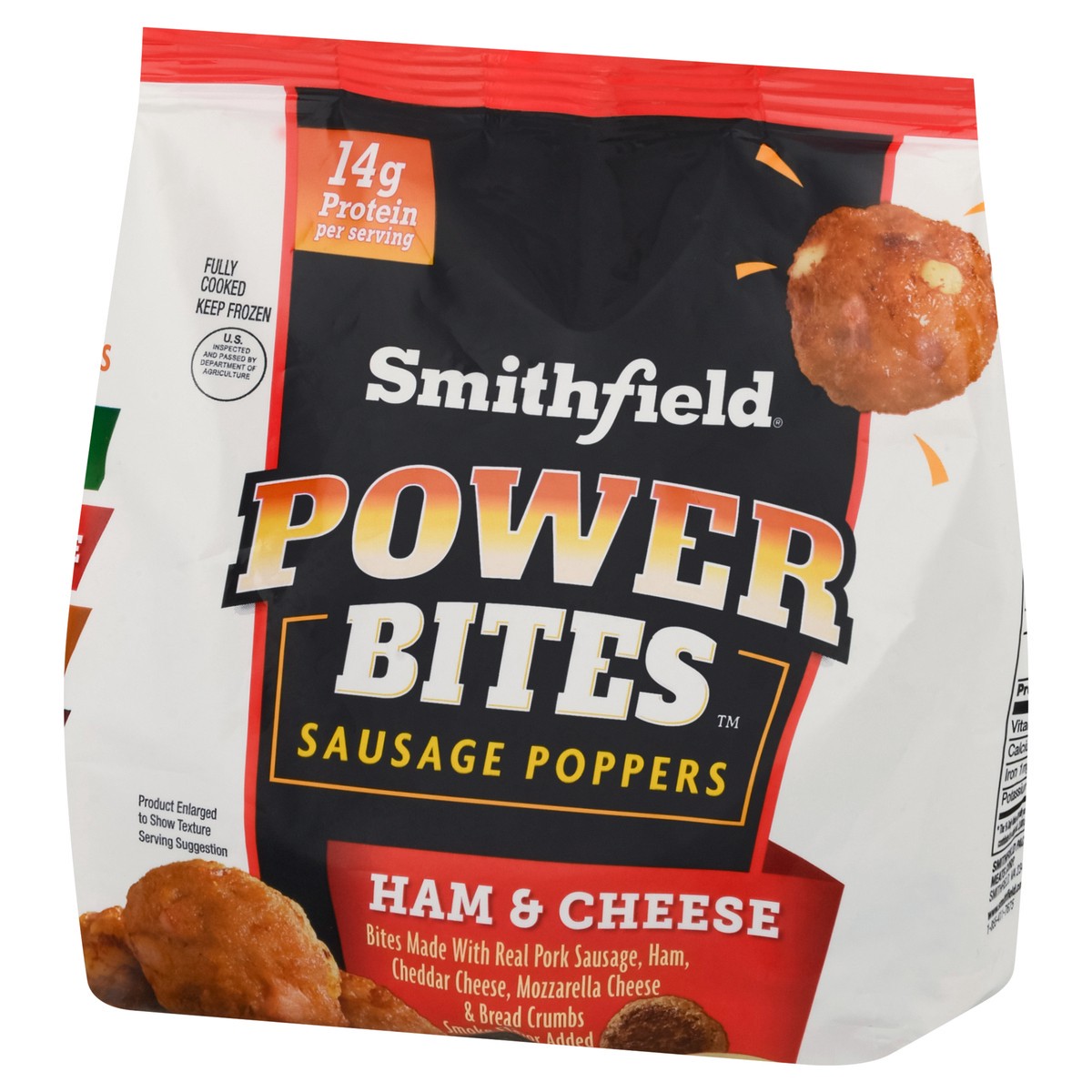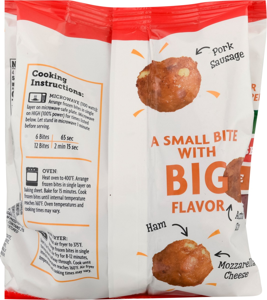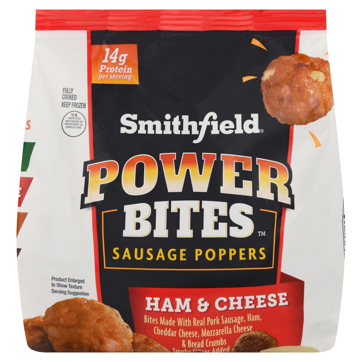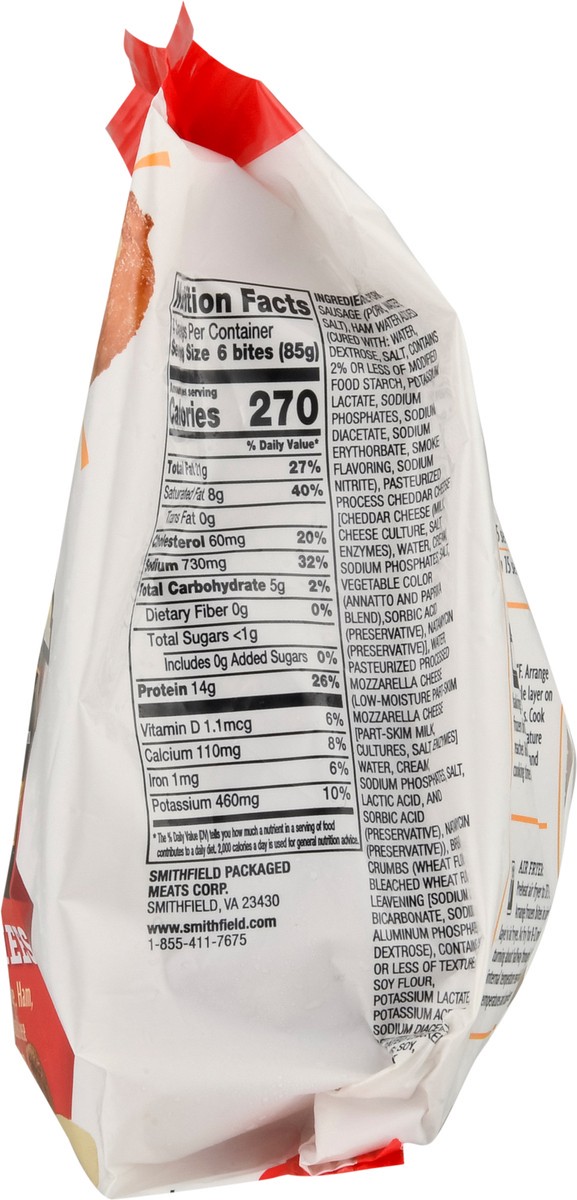 Bites made with real pork sausage, ham, cheddar cheese, mozzarella cheese & bread crumbs. Fully cooked. Pork sausage. Ham. Mozzarella cheese. A small bite with big flavor.