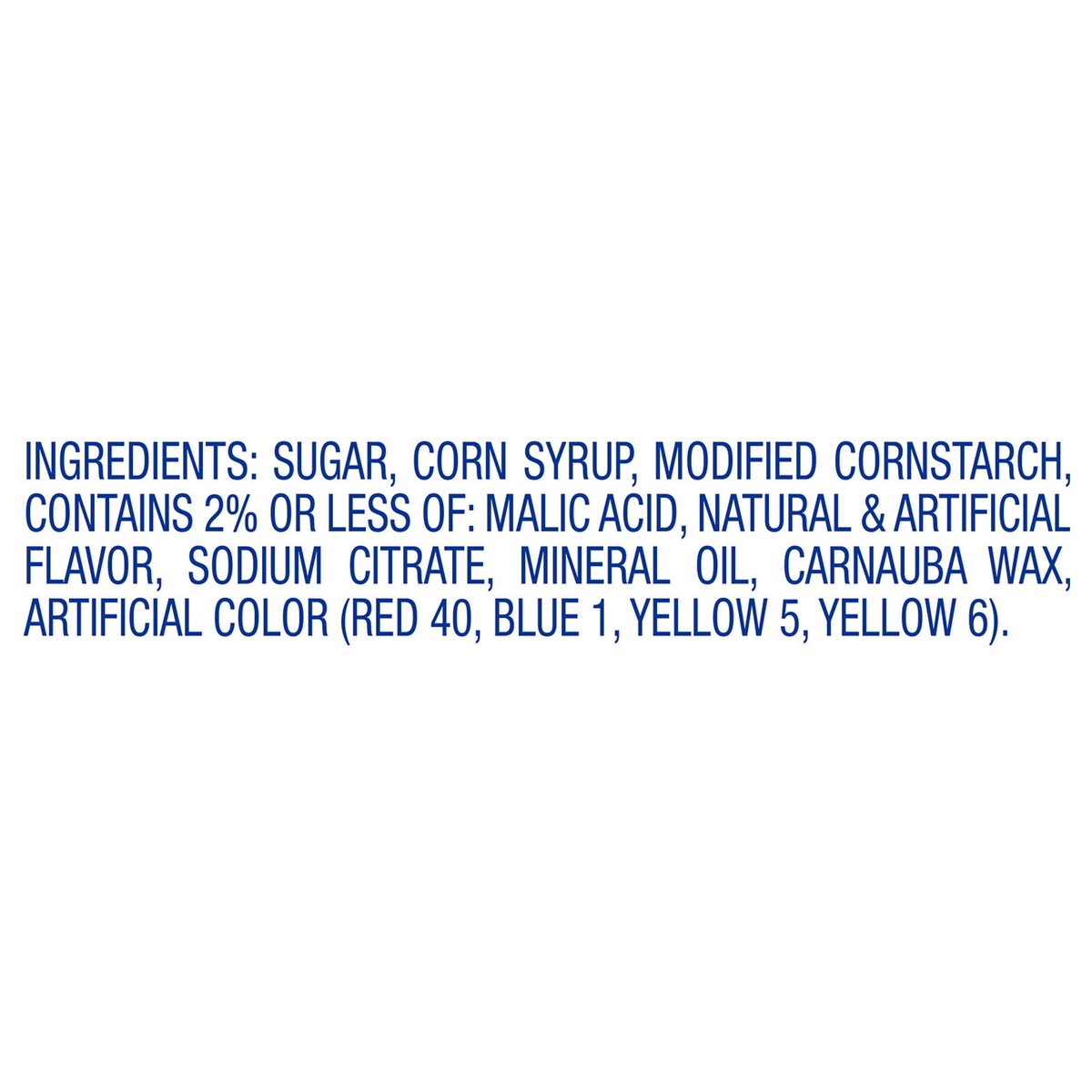 Sugar, Corn Syrup, Modified Cornstarch, Contains 2% or Less of: Malic Acid, Natural & Artificial Flavor, Sodium Citrate, Mineral Oil, Carnauba Wax, Artificial Color (Red 40, Blue 1, Yellow 5, Yellow 6…