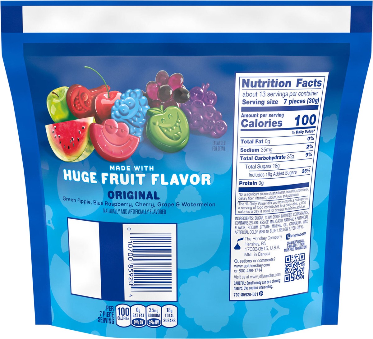- Contains one (1) 14-ounce bag of JOLLY RANCHER Gummies Original Fruit Flavored CandySoft and chewy gummy candies bursting with sweet fruity flavors like green apple, blue raspberry, cherry, grape and watermelon flavors for snack time at home, at work and on the roadAn exciting assortment of fruit flavored chewy gummy candies in a convenient bag ready to satisfy your snacking needsA delectable bag of sweet gummy treats great for birthday parties, wedding celebrations and baby shower candy buffetsAn unbelievably delicious gummy selection featuring bold colors and even bolder fruit flavors to brighten up your Valentine''s Day, Christmas, Halloween and Easter candy selectionsPair the vibrant colors of JOLLY RANCHER gummies with your favorite covered candy dish for a decoration that looks almost as good as it tastes