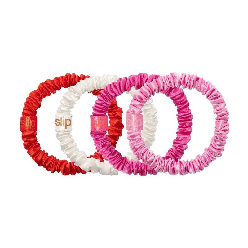 A set of four award-winning slip scrunchies. Designed to be anti crease, anti breakage. Upgrade your hair tie game.Includes: 1 x poppy / 1 x white / 1 x camellia / 1 x thistle pure silk skinny scrunch…