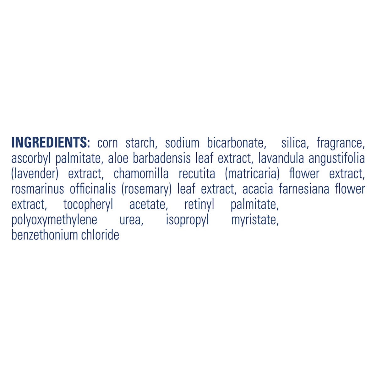 Corn Starch, Sodium Bicarbonate, Silica, Fragrance, Ascorbyl Palmitate, Aloe Barbadensis Leaf Extract, Lavandula Angustifolia (Lavender) Extract, Chamomilla Recutita (Matricaria) Flower Extract, Rosma…