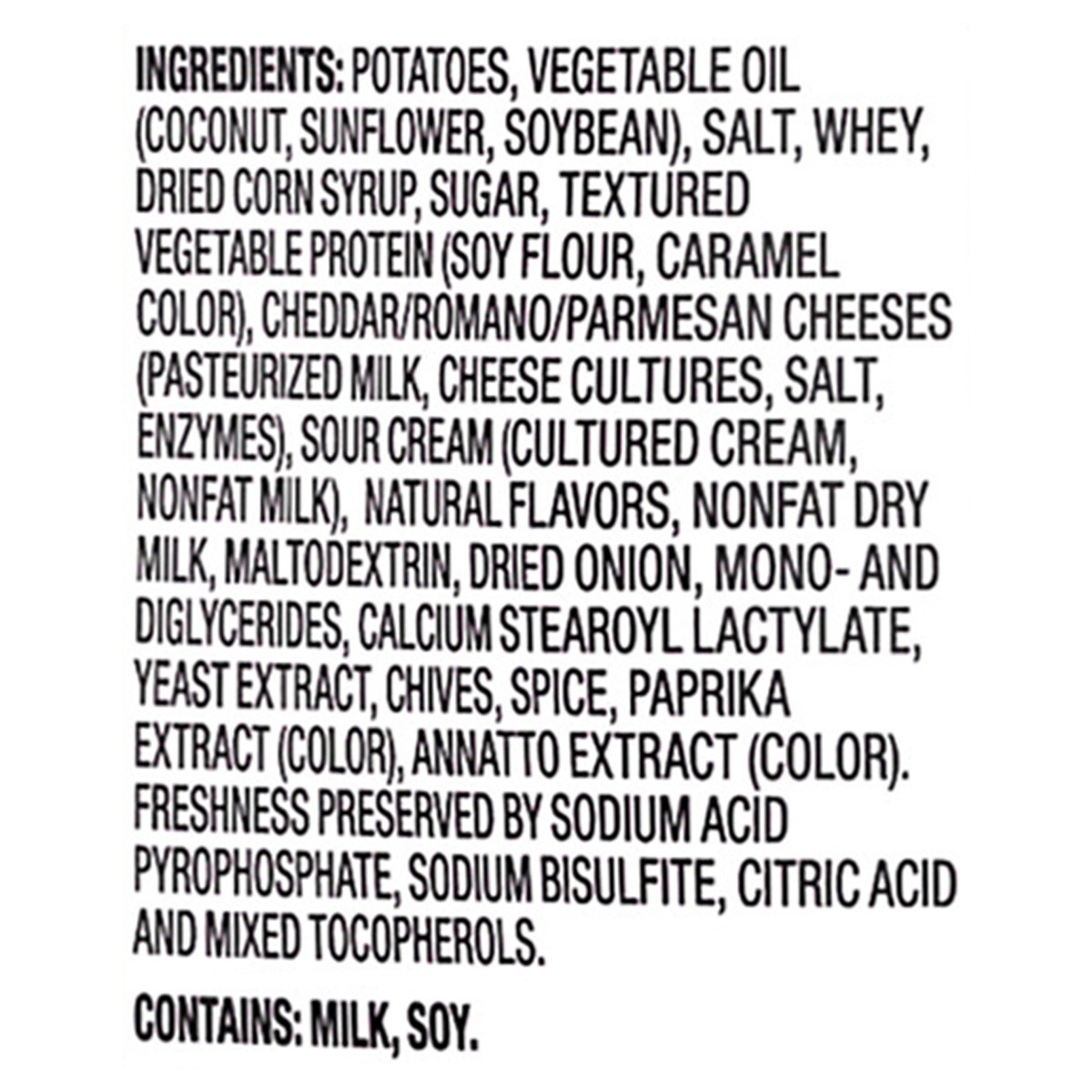 Potatoes, Vegetable Oil (Coconut, Sunflower, Soybean), Salt, Whey, Dried Corn Syrup, Sugar, Textured Vegetable Protein (Soy Flour, Caramel Color), Cheddar/Romano/Parmesan Cheeses (Pasteurized Milk, Ch…