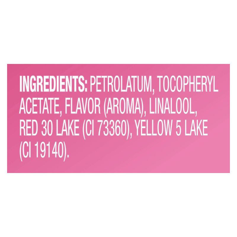 Petrolatum, Tocopheryl Acetate, Flavor (Aroma), Linalool, Red 30 Lake (CI 73360), Yellow 5 Lake (CI 19140).