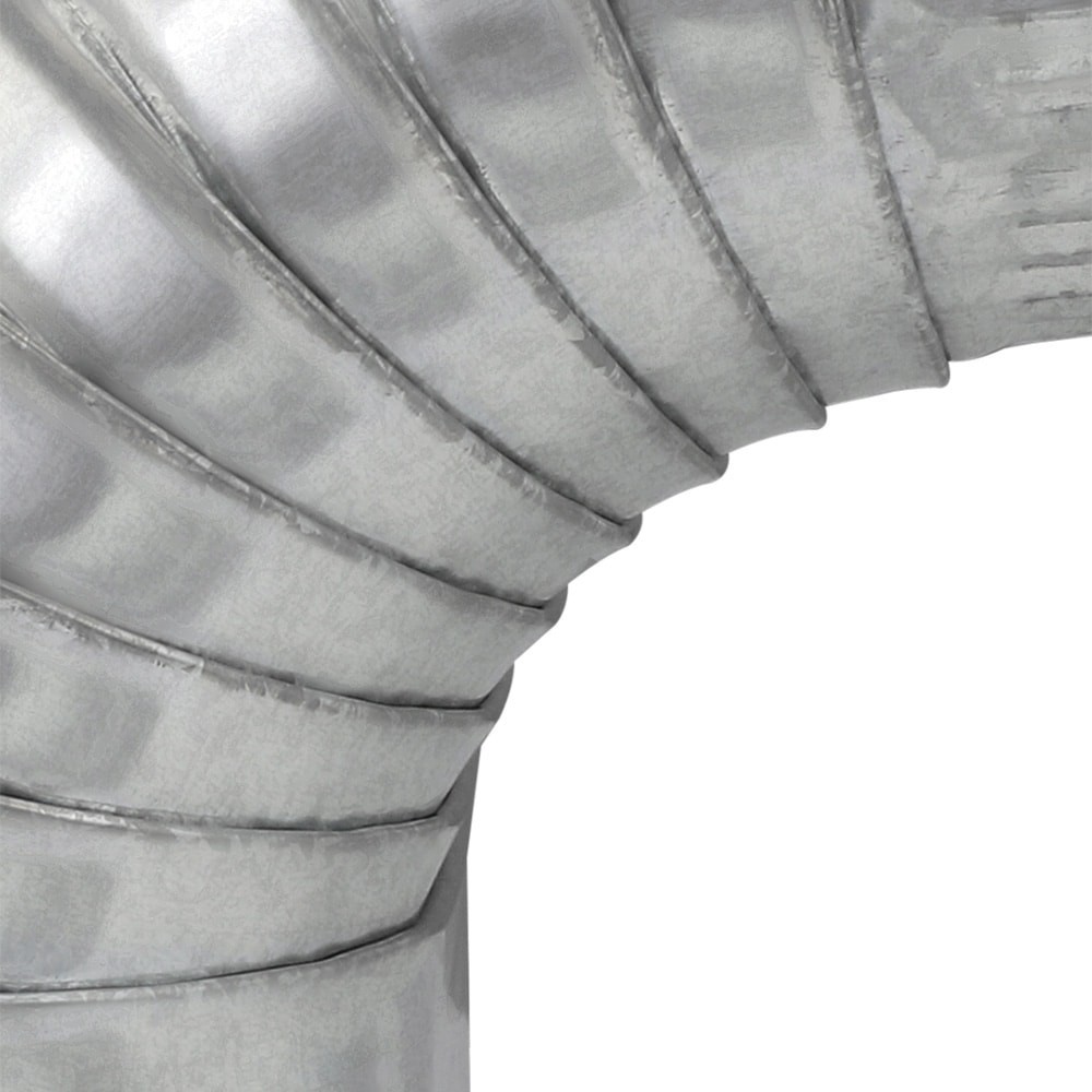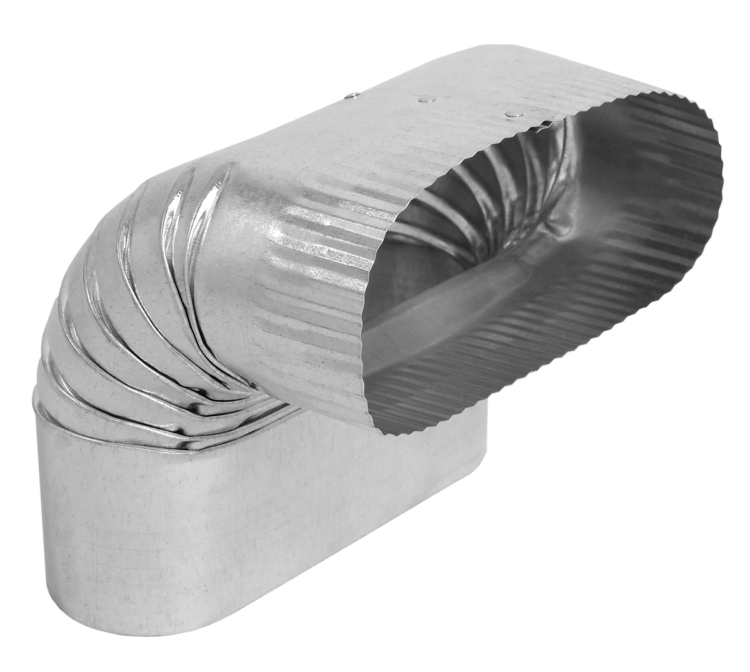 Used for changing the vertical direction of a run of oval pipe. Energy-efficient alternative to rectangular stack duct. Fixed at 90° angle. Galvanized steel construction.