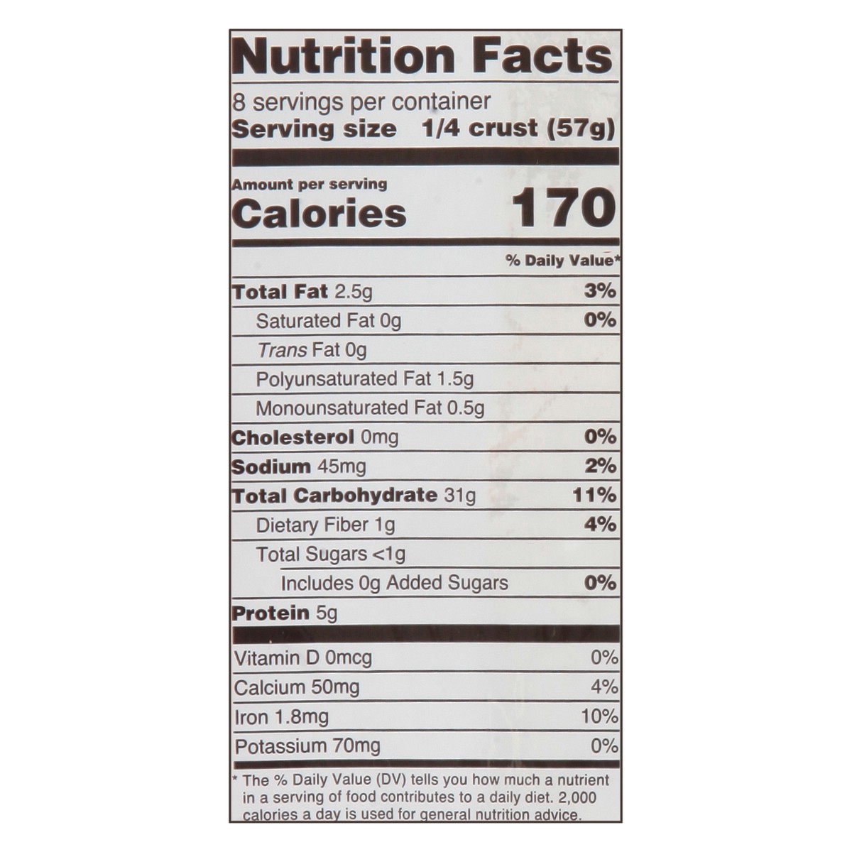 No artificial flavors or colors. Per 1/4 Crust: 170 calories; 9 g sat fat (0% DV); 45 mg sodium (2% DV); less than 1 g total sugars. 0 g trans fat. Low sodium. Cholesterol free. Ready to bake. 100% Sa…