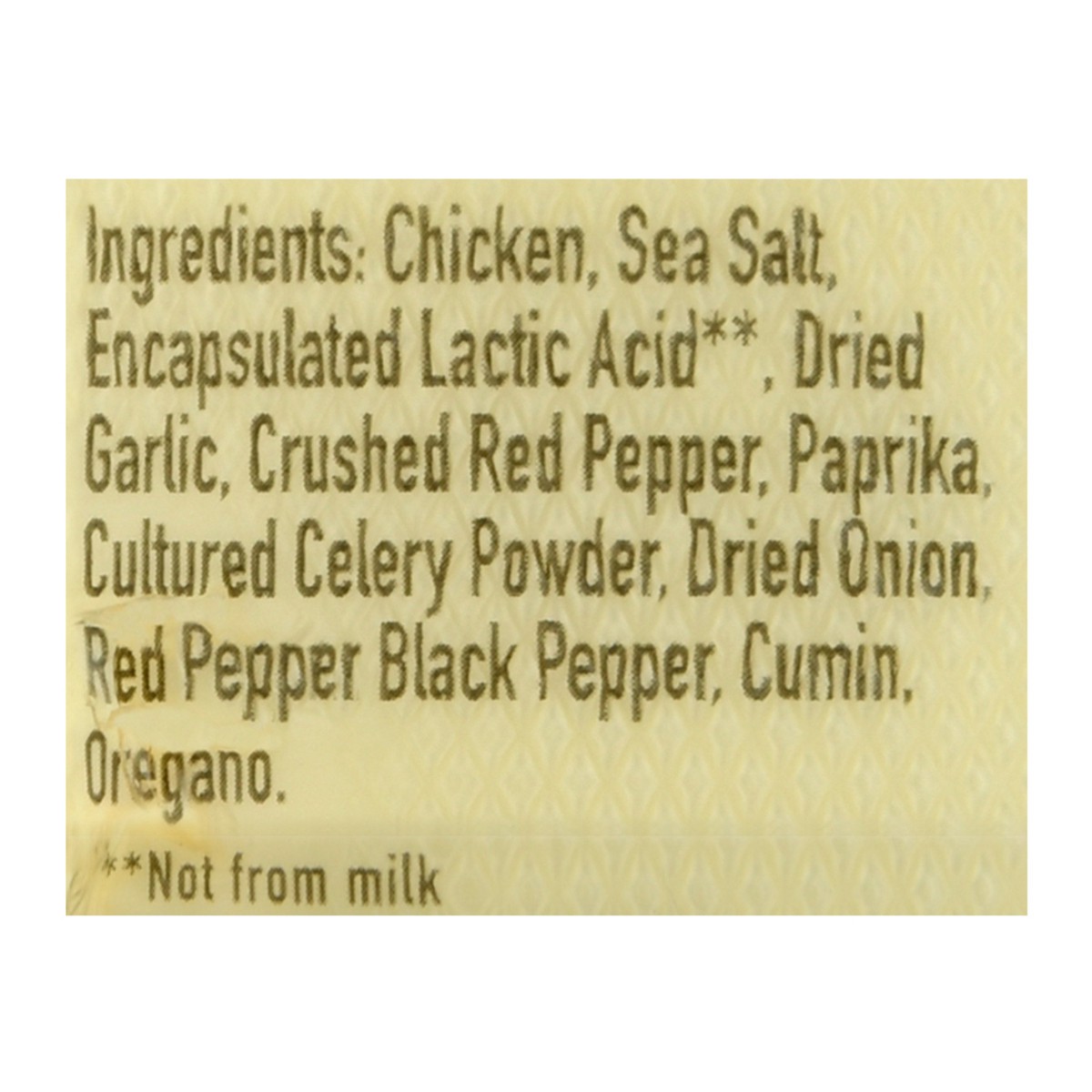 Chicken Meat, Encapsulated Lactic Acid**, Sea Salt, Dried Garlic, Crushed Red Pepper, Paprika, Dried Onion, Red Pepper, Cultured Celery Powder, Black Pepper, Cumin, Oregano. ** Not from Milk.