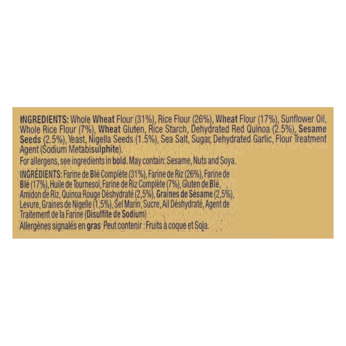 Whole Wheat Flour, Rice Flour, Wheat Flour, Sunflower Oil, Whole Rice Flour, Wheat Gluten, Rice Starch, Dehydrated Red Quinoa, Sesame Seeds, Yeasts, Nigella Seeds, Sea Salt, Sugar, Dehydrated Garlic, …