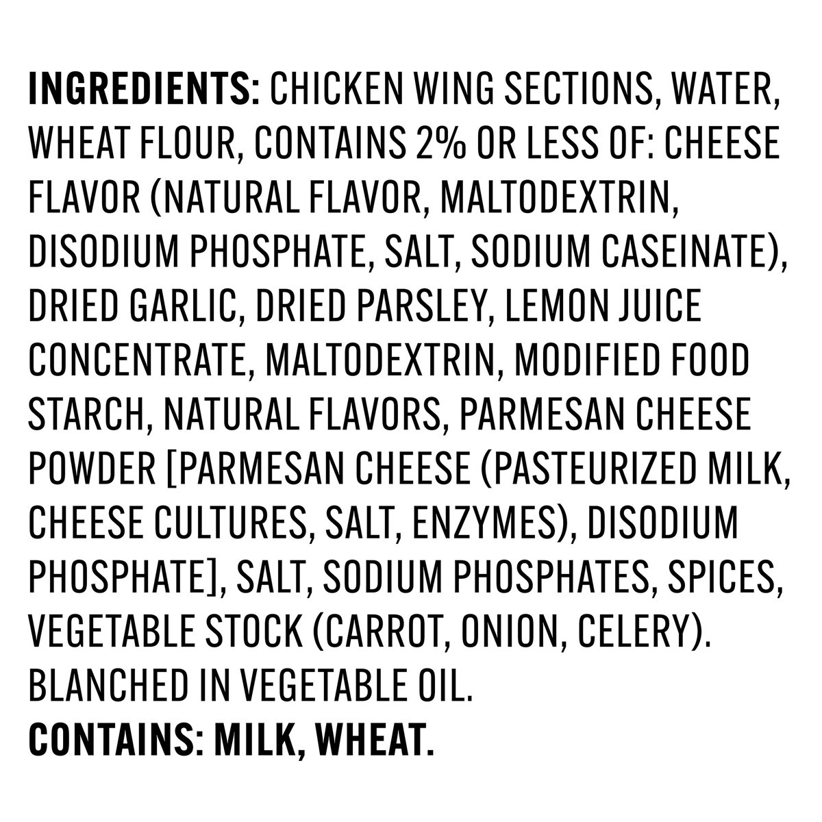 Chicken Wing Sections, Water, Wheat Flour, Contains 2% or Less of: Cheese Flavor (Natural Flavor, Maltodextrin, Disodium Phosphate, Salt, Sodium Caseinate), Dried Garlic, Dried Parsley, Lemon Juice Co…