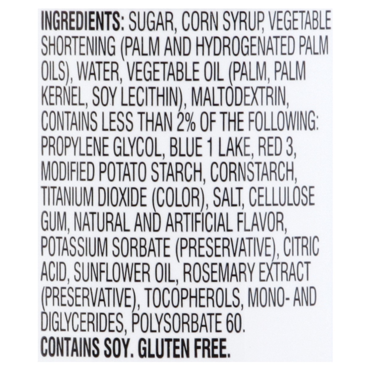 Sugar, Corn Syrup, Vegetable Shortening (Palm and Hydrogenated Palm Oils), Water, Vegetable Oil (Palm, Palm Kernel, Soy Lecithin), Maltodextrin, Contains Less than 2% of the Following: Propylene Glyco…