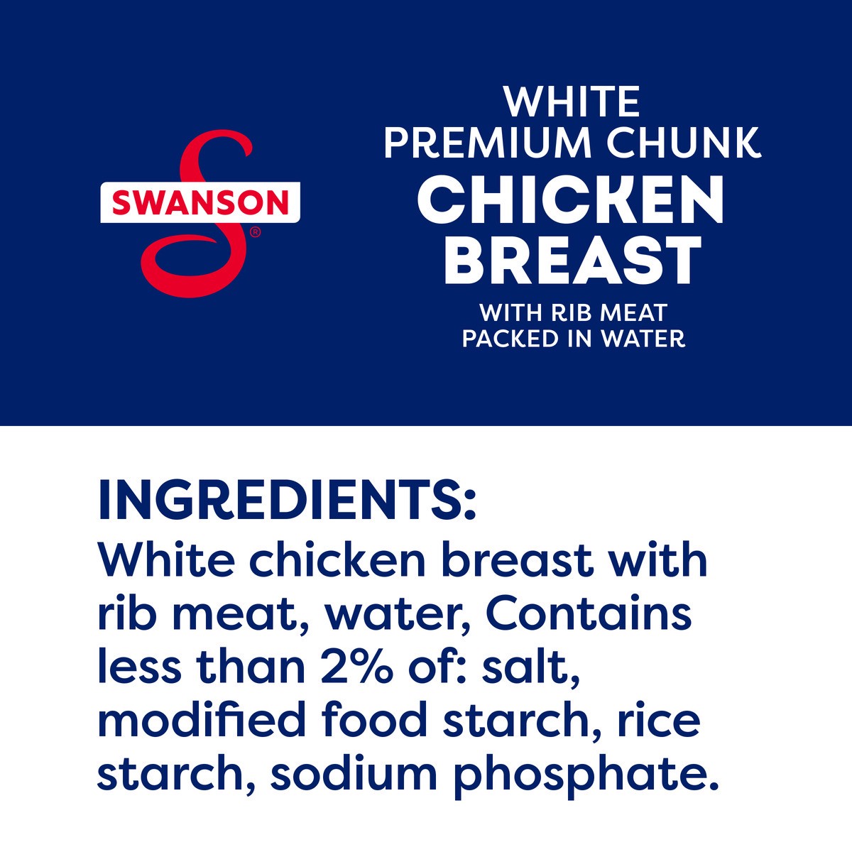 INGREDIENTS: WHITE CHICKEN BREAST WITH RIB MEAT, WATER, CONTAINS LESS THAN 2% OF: SALT, MODIFIED FOOD STARCH, RICE STARCH, SODIUM PHOSPHATE.