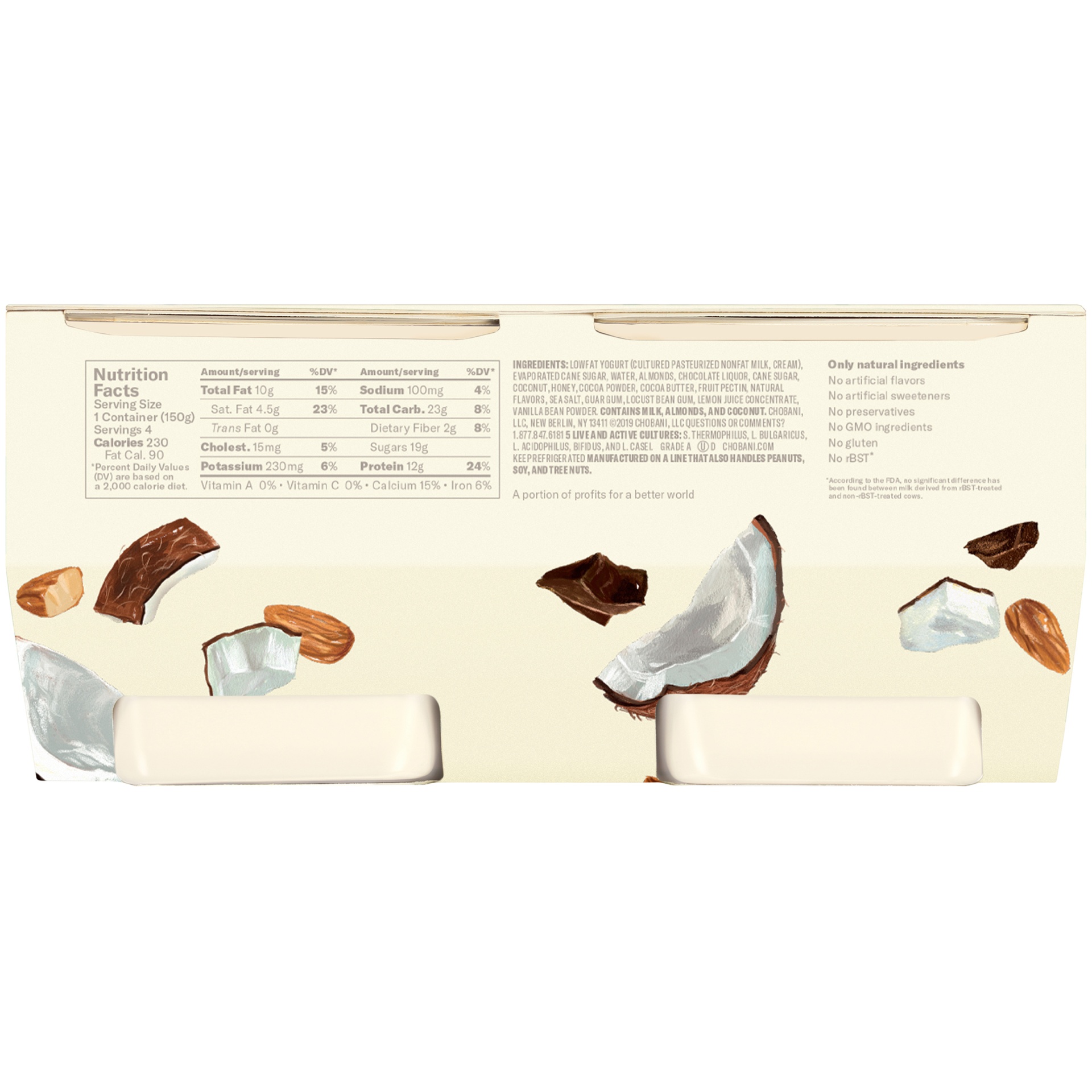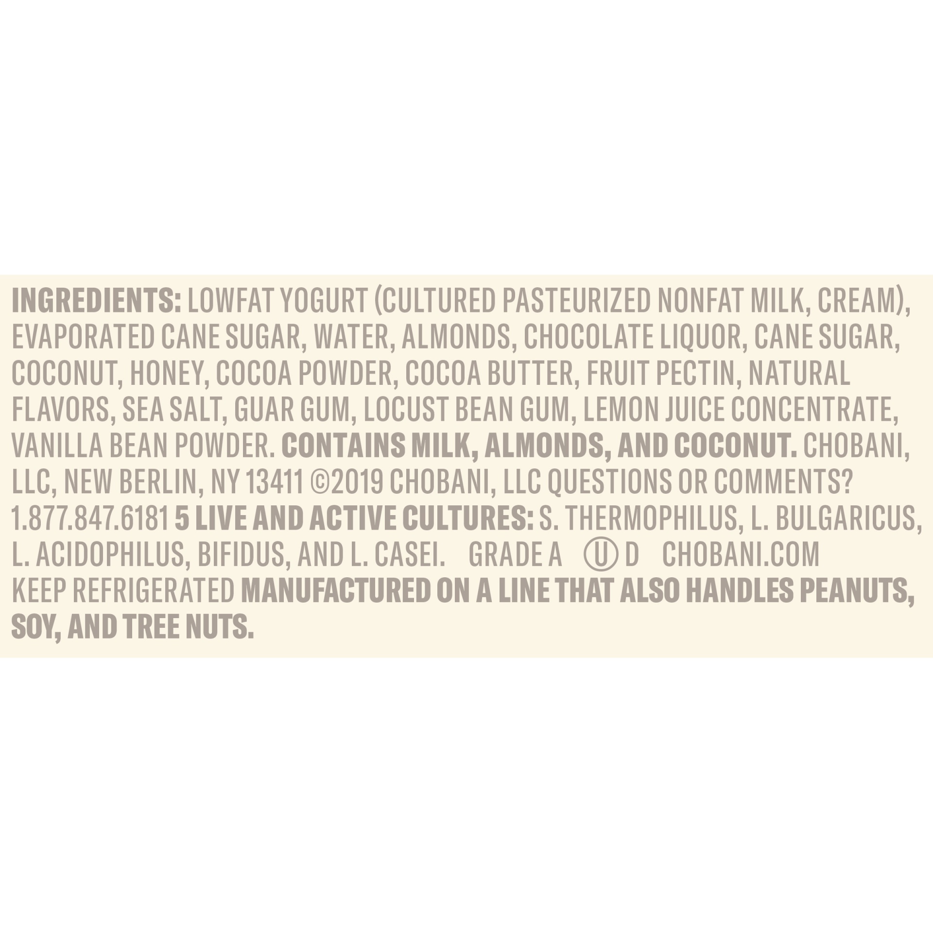 Cultured Lowfat Milk, Cane Sugar, Water, Almonds, Chocolate, Coconut, Tapioca Flour, Honey, Natural Flavors, Guar Gum, Sea Salt, Fruit Pectin, Cocoa, Cocoa Butter, Vanilla Bean Powder, Lemon Juice Con…