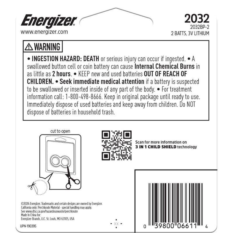 - 2 pack of Energizer 2032 Batteries, 3V Lithium Coin Batteries. Packaging may vary
