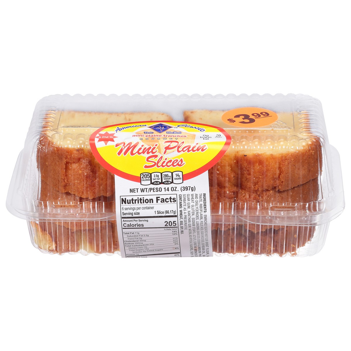 Enriched Bleached Wheat Flour (Wheat Flour, Niacin, Reduced Iron, Thiamine, Mononitrate, Riboflavin, Folic Acid), Sugar, Whole Eggs, Soybean Oil, Water, Modified Food Starch, Whey, Mono and Diglycerid…