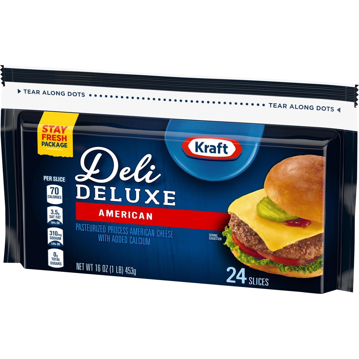 Kraft Deli Deluxe American Cheese Slices are creamy, rich and full of flavor. Enjoy our sliced American cheese with a mild, slightly tangy flavor and smooth texture that goes well with any meat or veg…