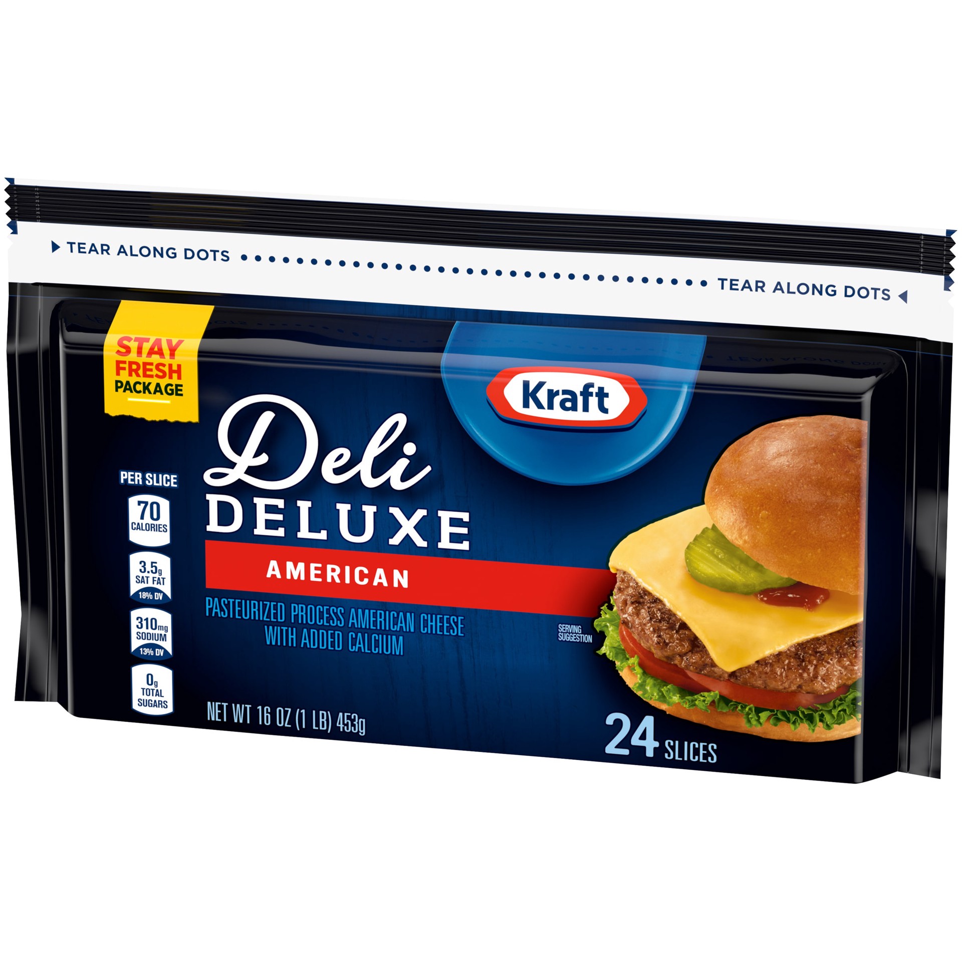 Kraft Deli Deluxe American Cheese Slices are creamy, rich and full of flavor. Enjoy our sliced American cheese with a mild, slightly tangy flavor and smooth texture that goes well with any meat or veg…