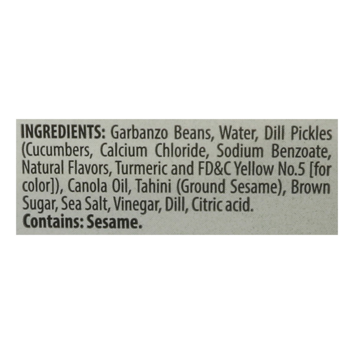 Garbanzo Beans, Water, Dill Pickles (Cucumbers, Calcium Chloride, Sodium Benzoate, Potassium Sorbate [to Maintain Freshness], Natural Flavors, Turmeric Oleoresin and FD&C Yellow No. 5 [for Color]), Ca…