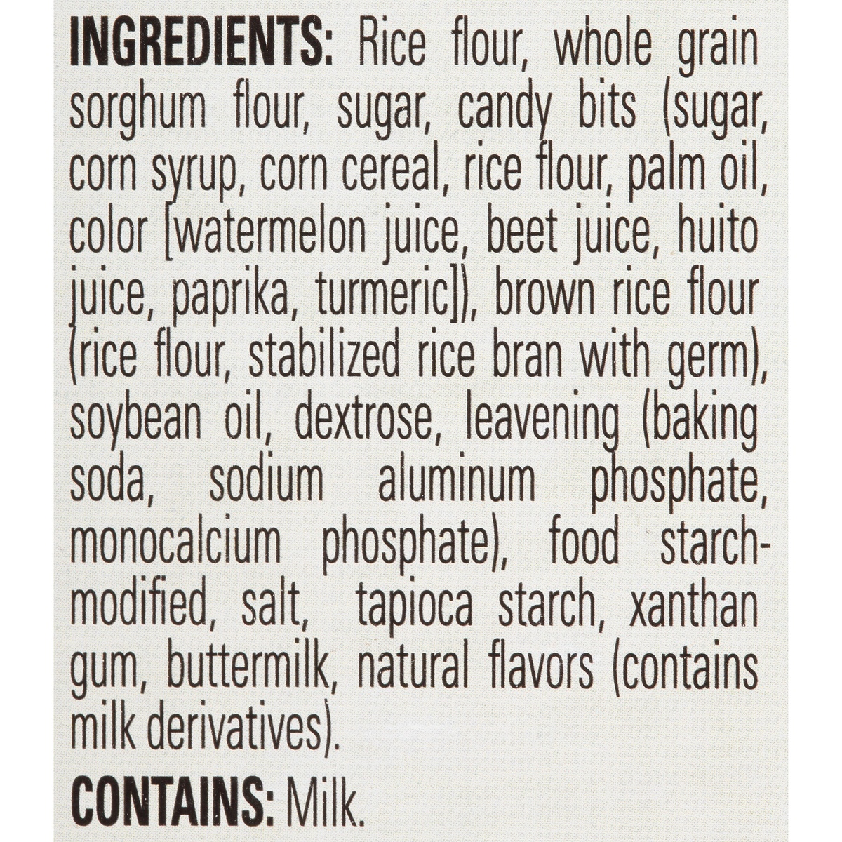 Rice Flour, Whole Grain Sorghum Flour, Sugar, Candy Bits (Sugar, Corn Syrup, Corn Cereal, Rice Flour, Palm Oil, Color [Watermelon Juice, Beet Juice, Huito Juice, Paprika, Turmeric]), Brown Rice Flour …
