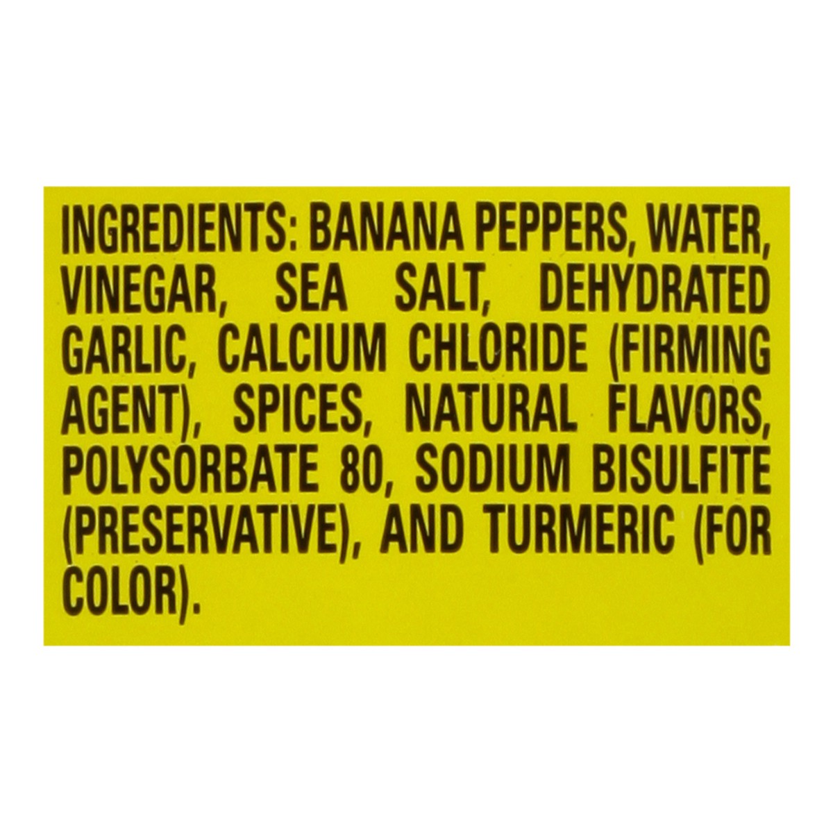 Banana Peppers, Water, Vinegar, Sea Salt, Dehydrated Garlic, Calcium Chloride (Firming Agent), Spices, Natural Flavors, Polysorbate 80, Sodium Bisulfite (Preservative), and Turmeric (for Color).