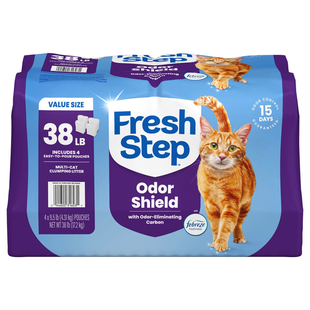 - FRESH STEP CLUMPING CAT LITTER: Four easy to pour and store 9.5 lb. bags of Fresh Step Multi-Cat Clumping Cat Litter with Febreze freshness